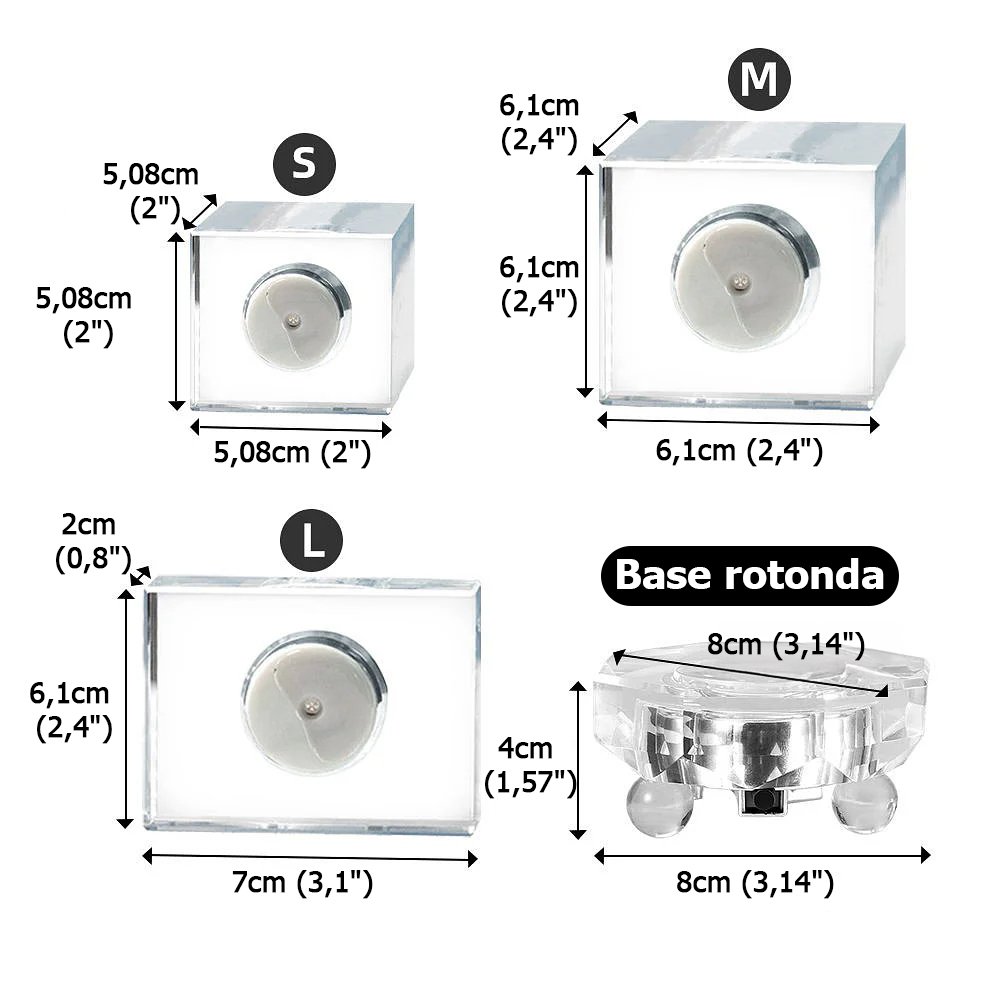 | Dimensione: | S: 5,08cm x 5,08cm x 5,08cm (2" x 2" x 2") M: 6,1cm x 6,1cm x 6,1cm (2,4" x 2,4" x 2,4") L: 7cm x 6,1cm x 2cm (3,1" x 2,4" x 0,8") Rotonda: 8cm x 8cm x 8cm (3,14" x 3,14" x 3,14") Peso: 370g Basi: S: 150g; M: 200g; L: 300g; Rotonda: 237,6g |