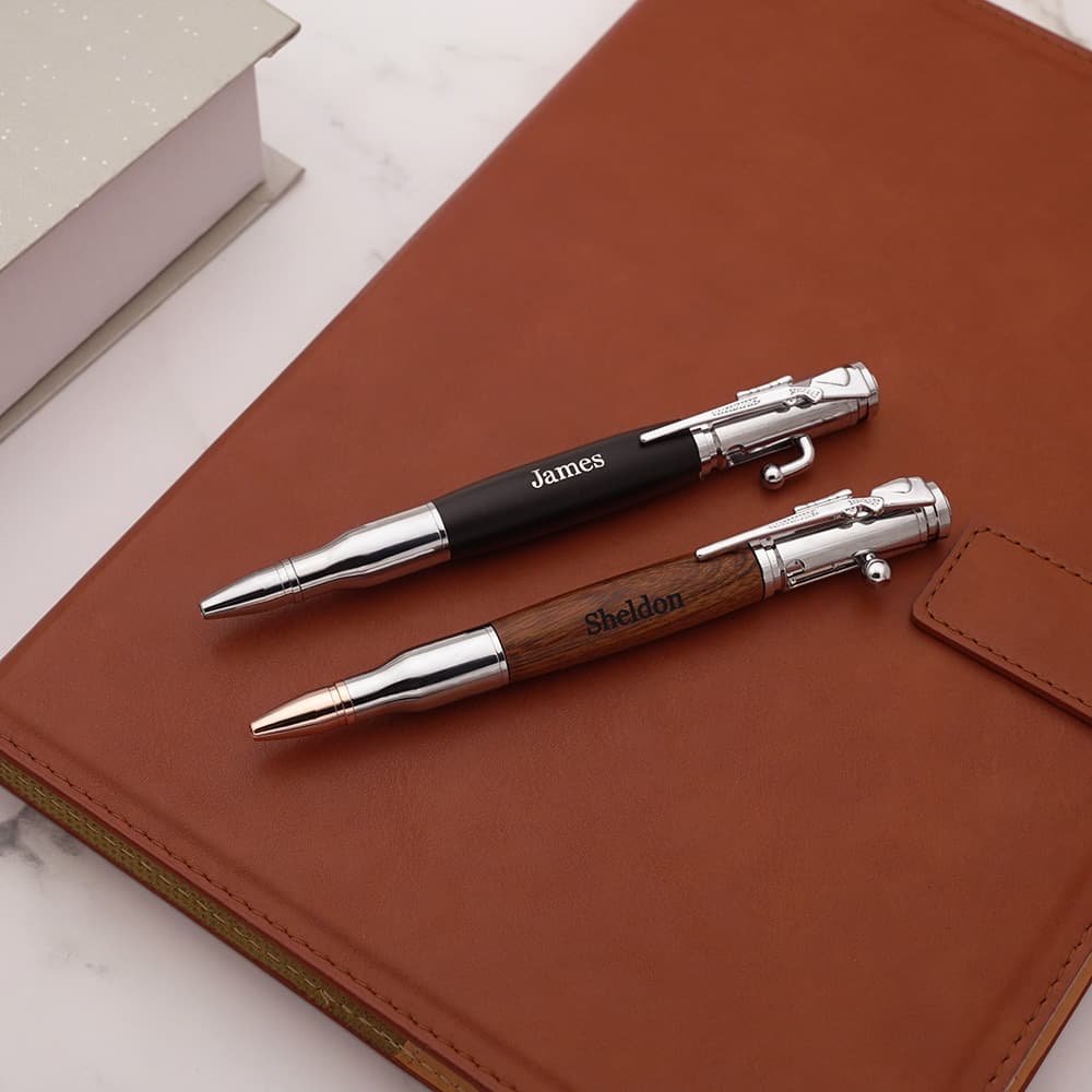 -Offerta da Callie Gifts con il design di un fucile e di un proiettile, questa penna è fatta apposta per gli appassionati di armi. Il fusto in legno di mogano di alta qualità, l'elegante penna a proiettile che si apre come un fucile bolt action e la punta di un proiettile calibro .30-06, rendono questa penna perfetta per gli appassionati di caccia e di storia. Inoltre, può essere personalizzata con nomi o messaggi, qualsiasi cosa si voglia mostrare sulla penna.