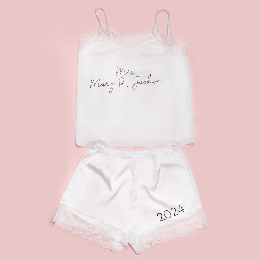 Il bellissimo completo in pizzo abbraccia delicatamente le curve, esaltando la silhouette naturale e creando un look seducente e sofisticato. La natura trasparente e traslucida del pizzo aggiunge un elemento di sensualità, permettendovi di sentirvi sexy senza sforzo. Che vogliate sorprendere il vostro partner o semplicemente abbandonarvi alle coccole, questo pigiama da sposa in pizzo è un'aggiunta imperdibile al vostro corredo nuziale, che promette stile e fascino nella vostra notte speciale.