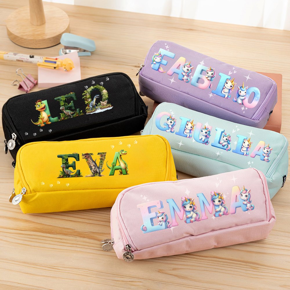 L'astuccio ha un divertente tema dinosauro o unicorno, con colori vivaci e caratteri giocosi, perfetto per studenti di tutte le età. Puoi personalizzarlo con il tuo nome, trasformandolo in un accessorio unico e alla moda.