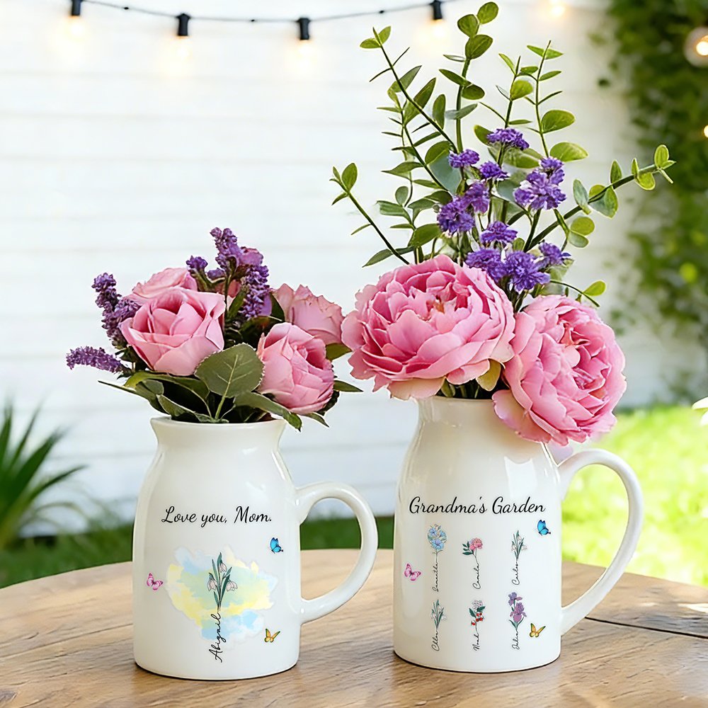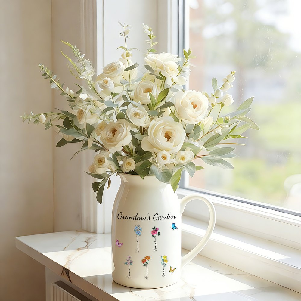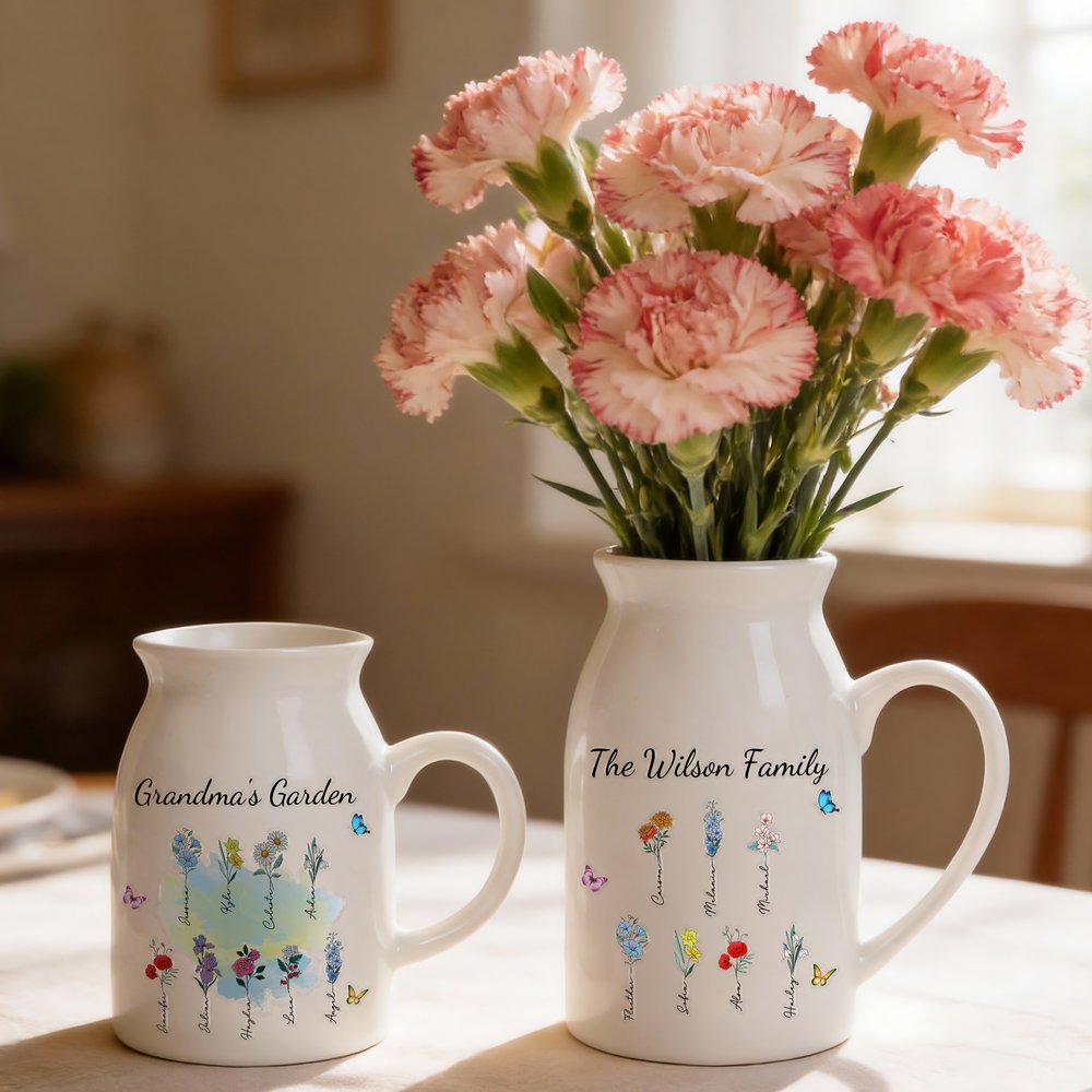 Questo vaso è ispirato a vivaci fiori di nascita, circondati da farfalle, che mettono in risalto la bellezza e la fragranza dei fiori. È possibile personalizzarlo con 1-10 fiori di nascita, che rappresentano ogni membro della famiglia, e aggiungere nomi e un titolo personalizzato per creare un giardino caldo e gioioso.