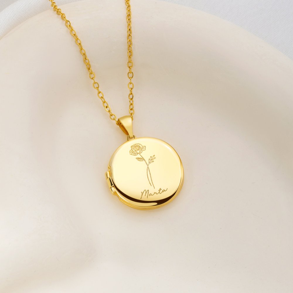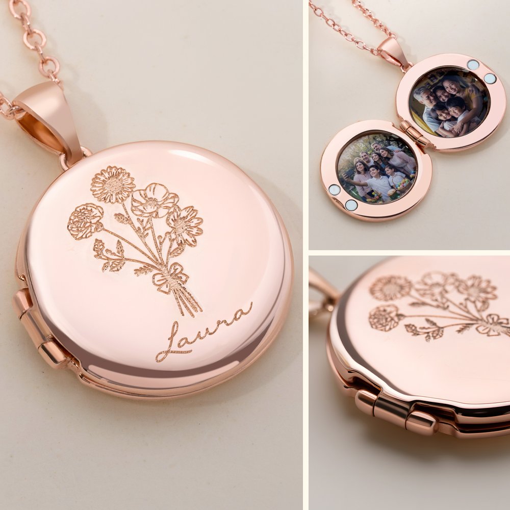 Questa collana combina i fiori di nascita e la personalizzazione con foto come linguaggio principale di design, creando un doppio modo per esprimere le tue emozioni. Lo strato esterno mostra con delicatezza i dodici simboli dei fiori di nascita insieme al tuo nome, per un tocco davvero personale; lo strato interno può ospitare foto di famiglia, amici o sorrisi dei tuoi cari, rendendola speciale e piena di valore emotivo.