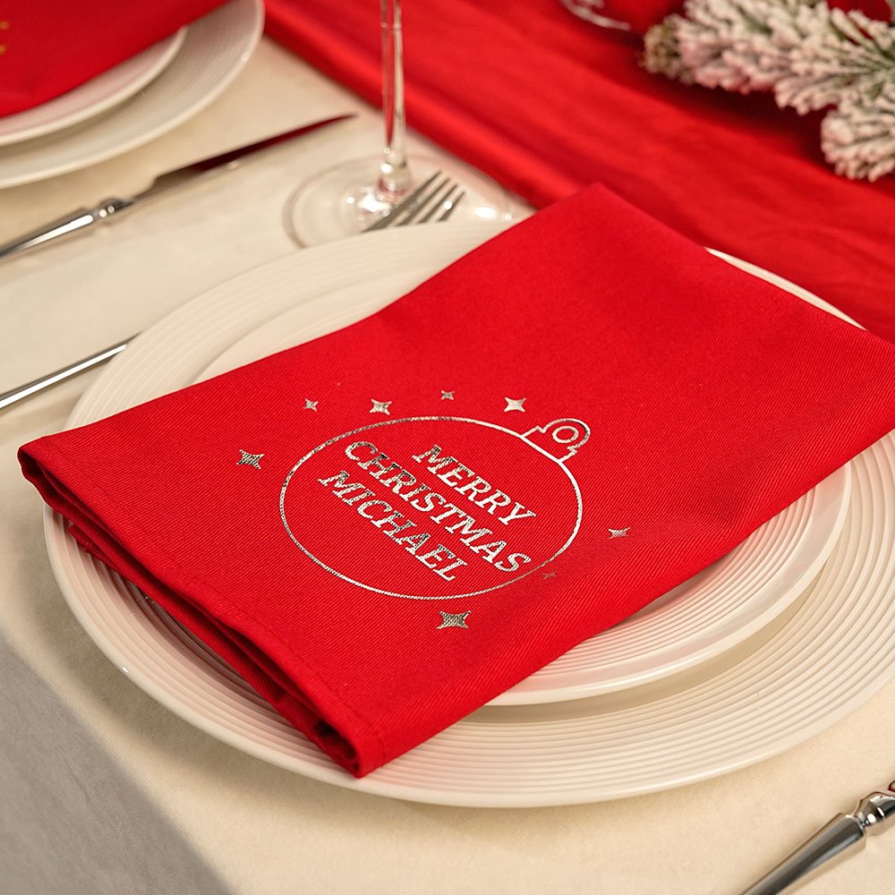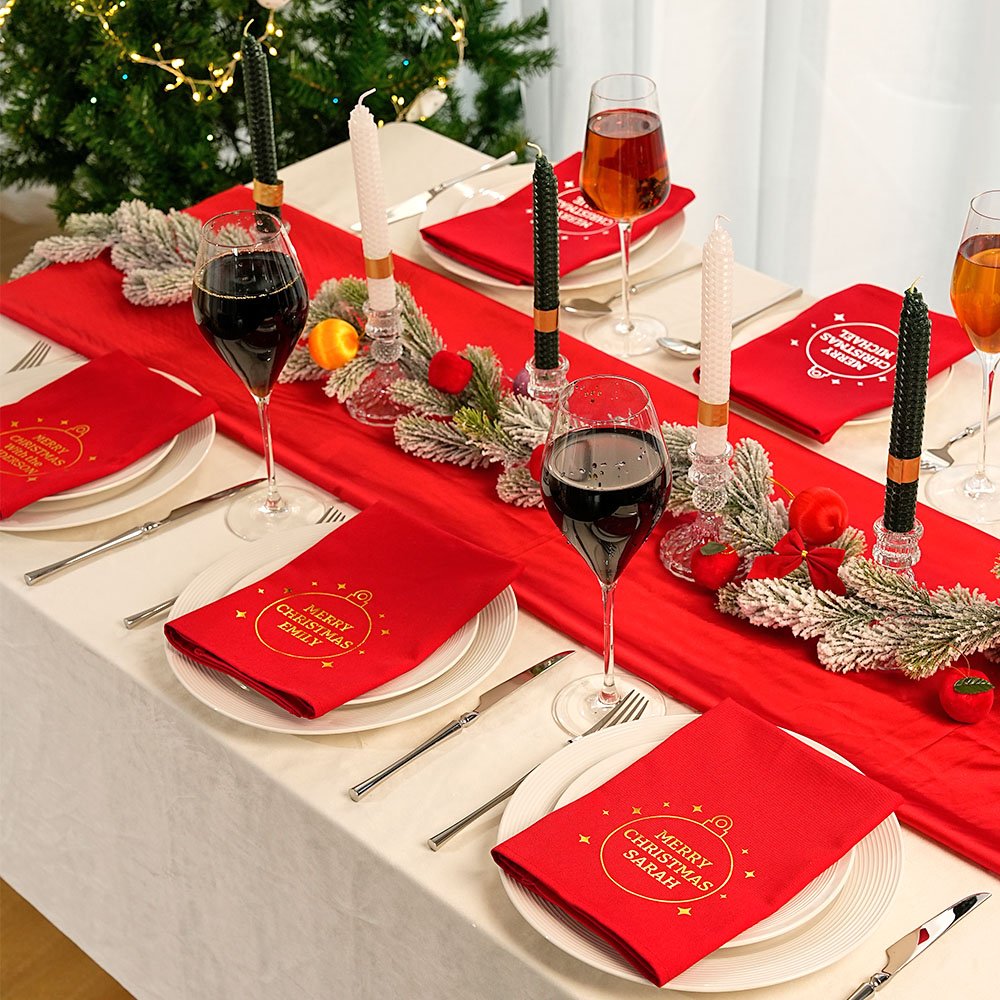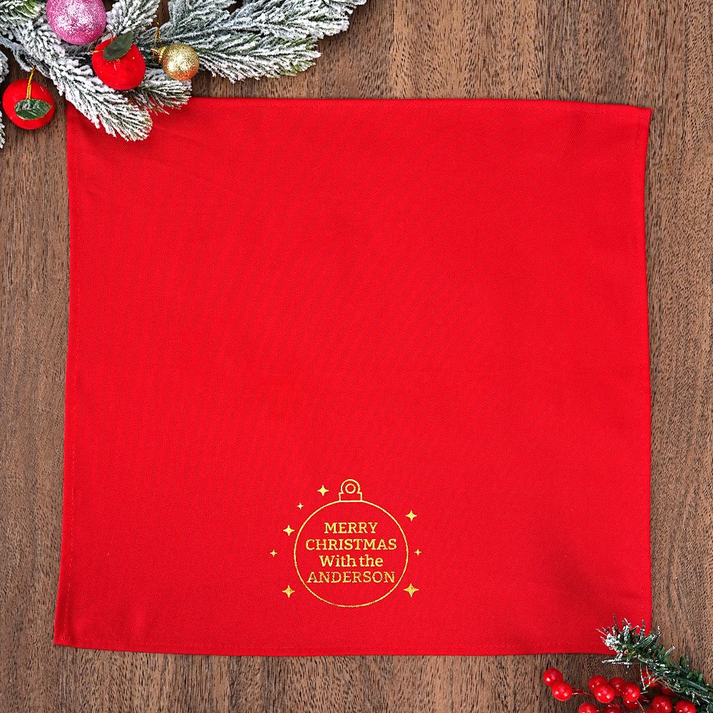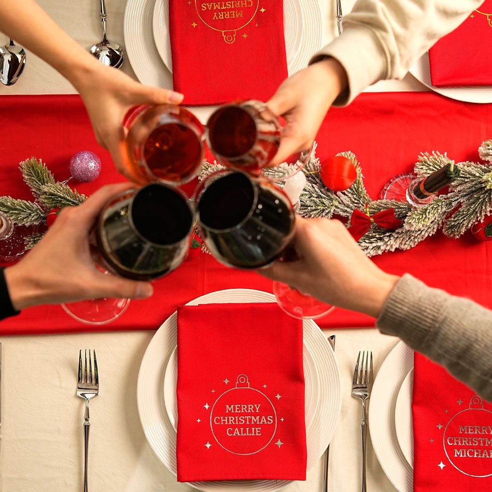Con uno splendido design rosso classico e la scritta "Merry Christmas" stampata su ogni tovagliolo, potrete elevare la vostra tavola natalizia con tovaglioli personalizzati. La personalizzazione con i cognomi o i nomi dei membri della famiglia aggiunge un tocco significativo ed è l'aggiunta perfetta alle vostre riunioni natalizie.