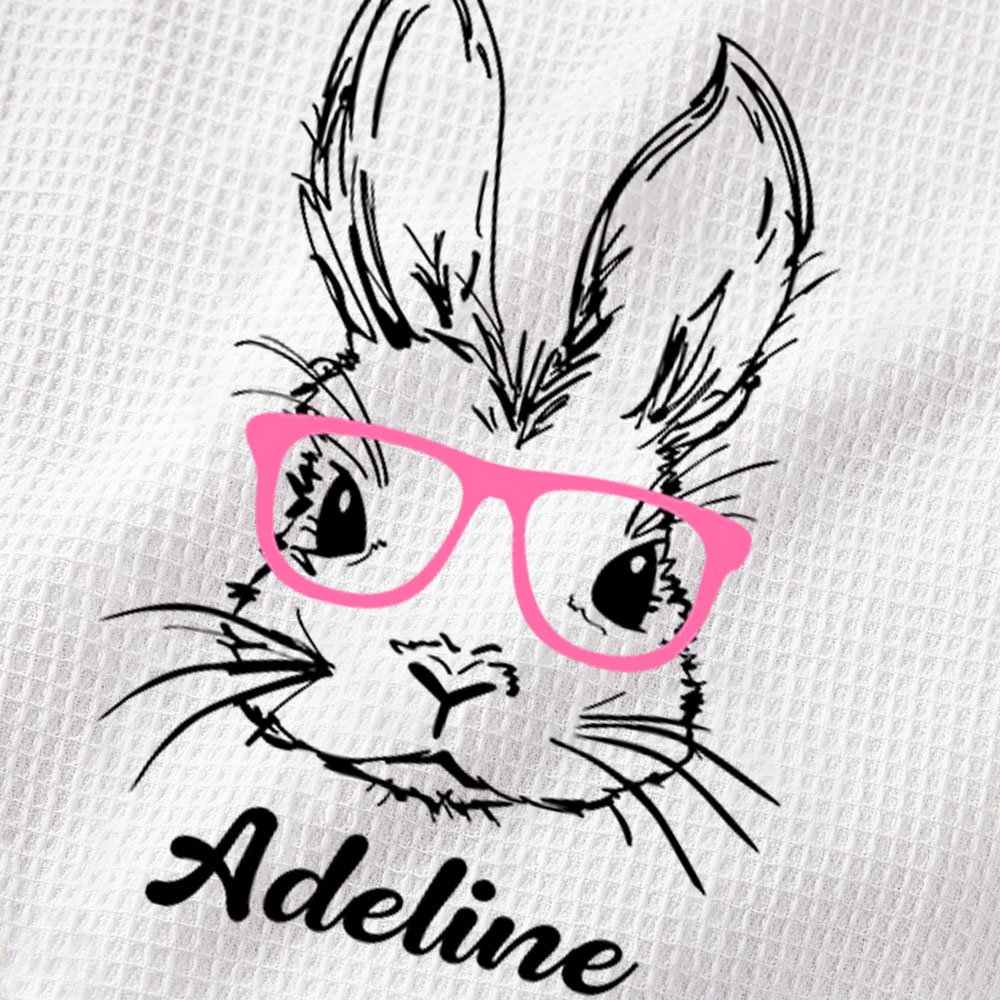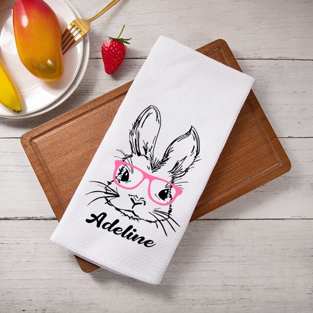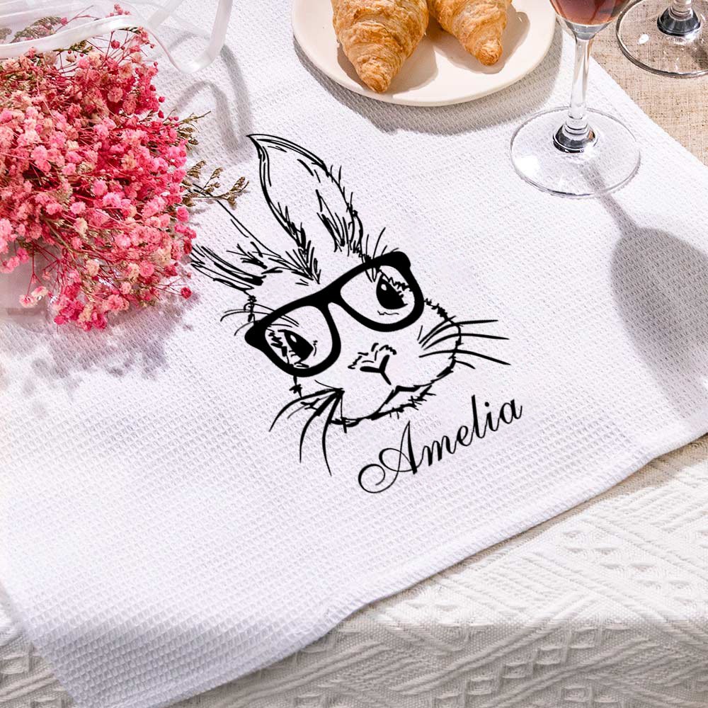 Questo asciugamano da cucina presenta un affascinante coniglietto che indossa gli occhiali, aggiungendo un tocco di estrosità e divertimento alle vostre celebrazioni pasquali. È possibile personalizzarlo con un nome e cinque caratteri tra cui scegliere, rendendolo un regalo speciale per una persona cara.