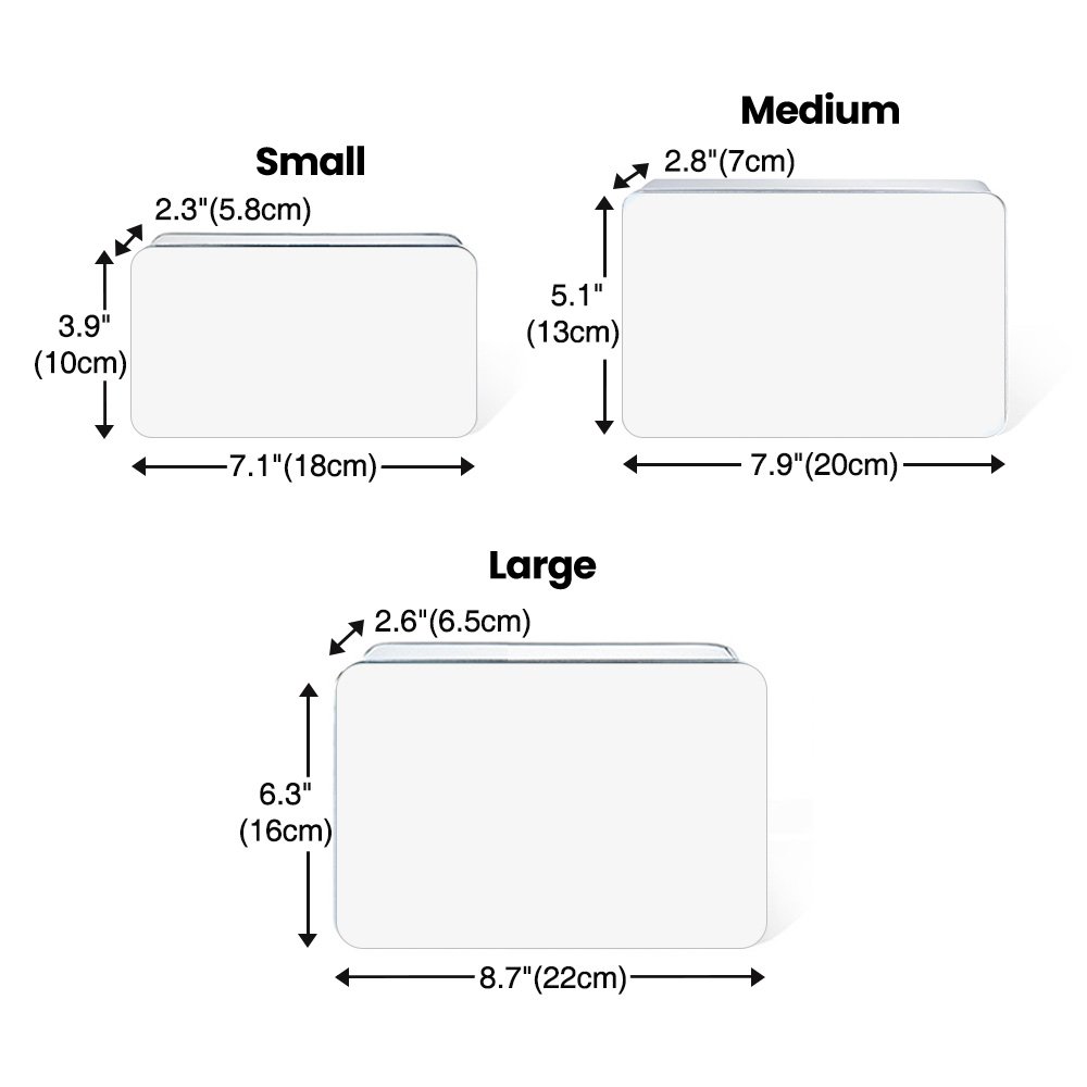 | Dimensione: | Piccolo - 7,1" × 3,9" × 2,3" (18 cm × 10 cm × 5,8 cm) Medio - 7,9" × 5,1" × 2,8" (20 cm × 13 cm × 7 cm) Grande - 8,7" × 6,3" × 2,6" (22 cm × 16 cm × 6,5 cm) |