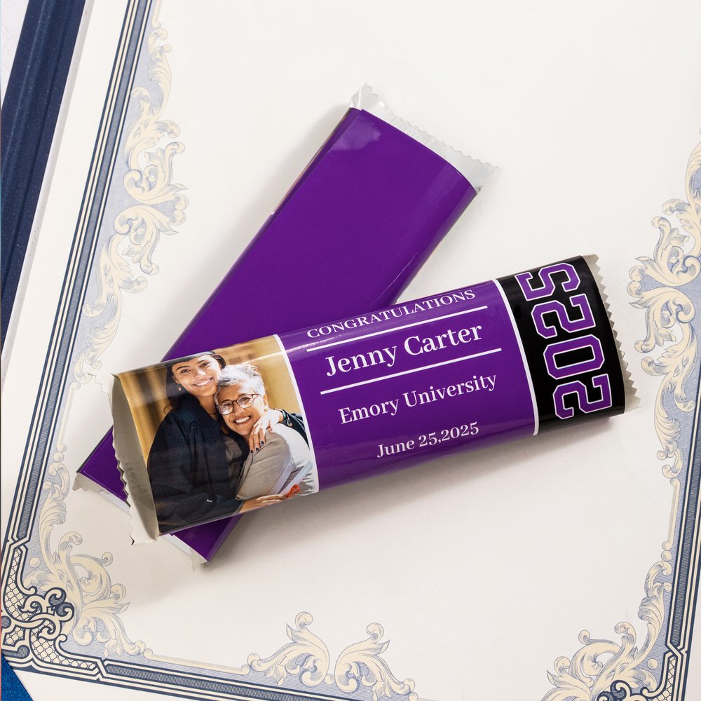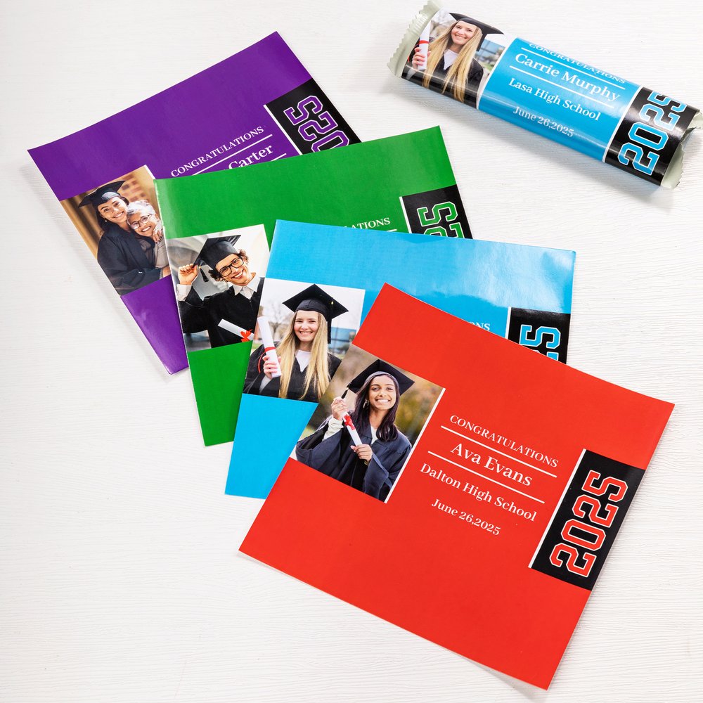 Utilizzate queste carte per caramelle come parte dell'arredamento della vostra festa di laurea. I loro colori vivaci e il design personalizzato attireranno l'attenzione e creeranno un tema coeso e festoso che riflette il successo e il percorso del laureato.