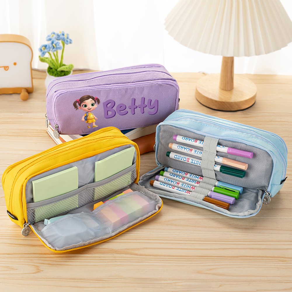 Questo astuccio presenta colori vivaci e personaggi in stile cartone animato 3D, catturando subito l'attenzione e trasmettendo un senso di innocenza e vitalità infantile. I motivi a farfalla o a cancelleria stimolano l'immaginazione del tuo bambino. Puoi personalizzarlo con il nome, trasformandolo in un assistente di studio unico e personale.