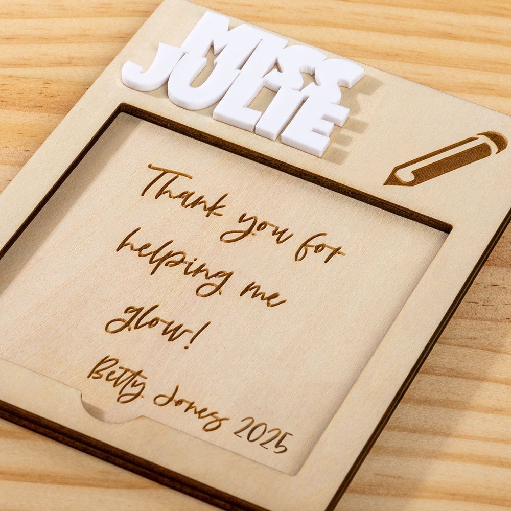 I nostri portablocco presentano un'incisione 3D per un effetto visivo unico e possono essere personalizzati con il nome dell'insegnante in alto e un messaggio di ringraziamento in basso, in modo che l'insegnante possa vedere il vostro messaggio a sorpresa quando finisce i foglietti adesivi. Queste personalizzazioni si combinano con matite, fiori e altri elementi per creare un accessorio da ufficio unico e pratico, aggiungere un tocco di eleganza alla scrivania ed esprimere il vostro apprezzamento per gli insegnanti.
