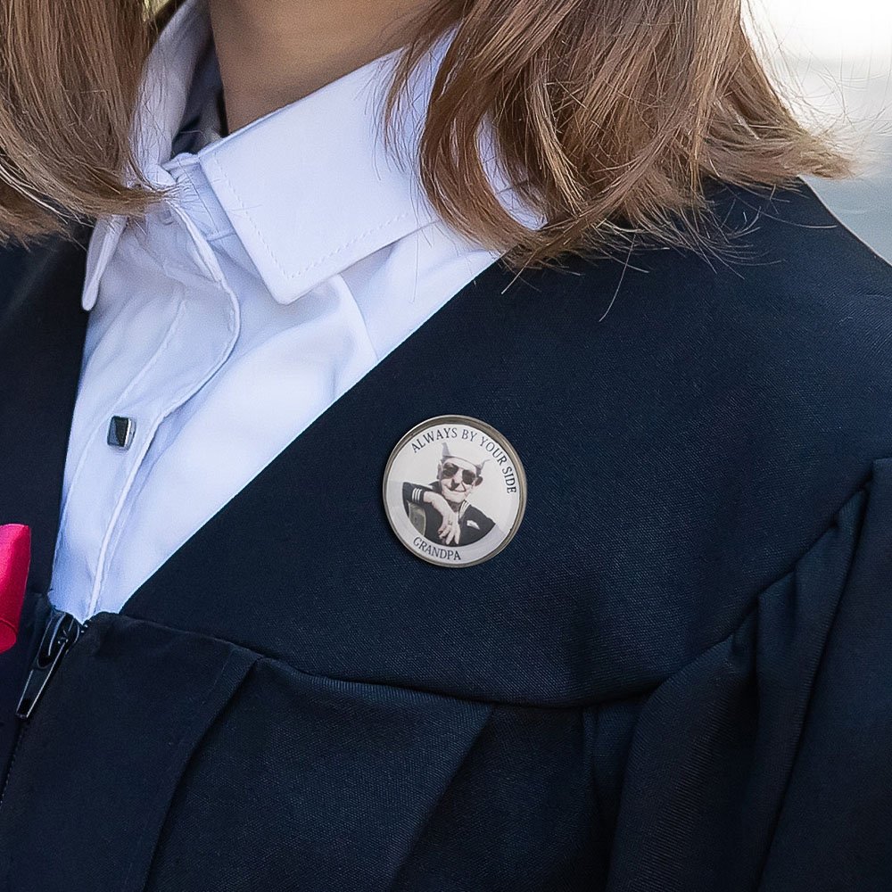 La dimensione interna della spilla è di 1" (2,5 cm) ed è dotata di un supporto standard per graffette. Progettata con precisione e cura, questa spilla è dotata di una base in metallo resistente con finitura lucida, che mette in evidenza il nome e la foto incisi. La spilla è fissata con un robusto fermaglio, per garantire che rimanga saldamente attaccata agli abiti per tutta la durata dell'evento.