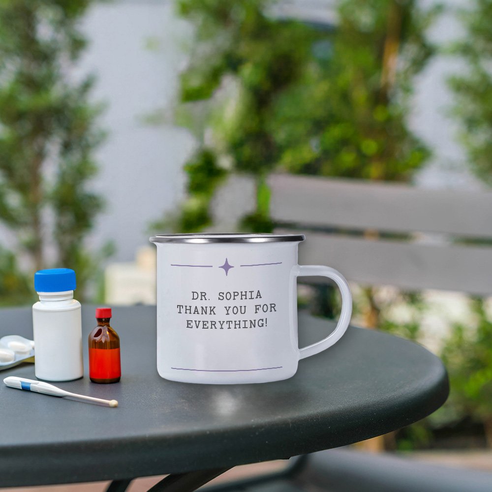 Questa tazza smaltata presenta un messaggio personalizzato che rende omaggio al personale medico. È un'affermazione forte e positiva del grande lavoro che fanno gli infermieri. È possibile aggiungere alla tazza parole di apprezzamento, elogio o benedizione. In questo modo potrete esprimere la vostra gratitudine agli infermieri che fanno la differenza nella vostra vita.
