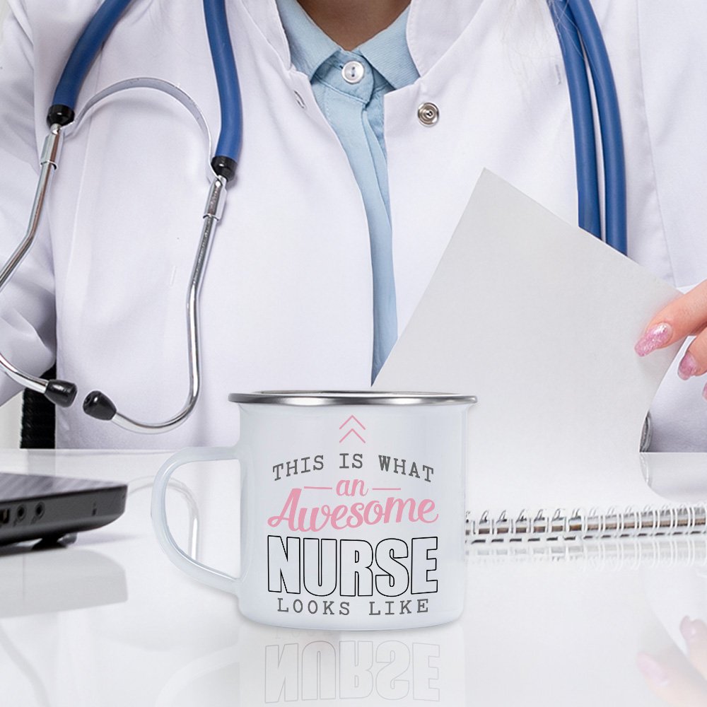 Lo slogan sulla tazza smaltata è elegante e accattivante: "Questo è l'aspetto di un'infermiera fantastica". La parola "an" è evidenziata da una freccia verso l'alto, a simboleggiare la crescita e il progresso. La parola "Awesome" è evidenziata con un carattere colorato in grassetto, che sottolinea il significato di lode. La parola "Nurse" è scritta con un carattere nero più grande per farla risaltare maggiormente. La combinazione di caratteri e colori crea un design visivamente accattivante, moderno e affascinante.