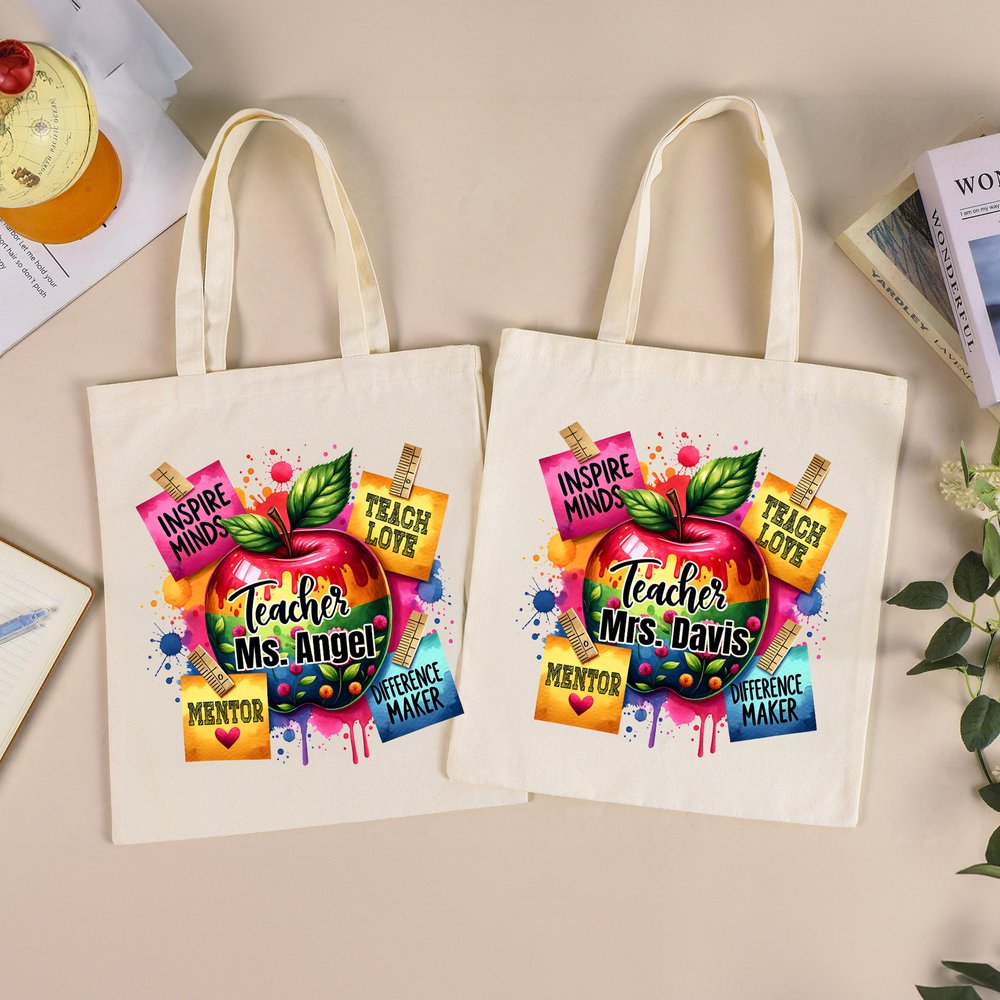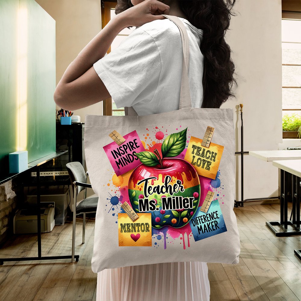 Caratterizzata dal disegno di una mela colorata e dalla scritta "Inspire minds, Teach love, Difference maker", questa tote bag trasmette magnificamente la gratitudine per gli insegnanti. Inoltre, può essere personalizzata con il vostro nome, rendendola un regalo distintivo e sentito per onorare gli educatori.