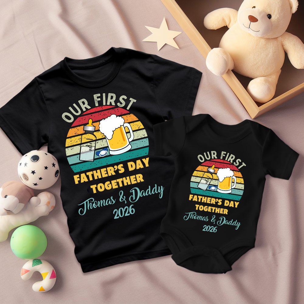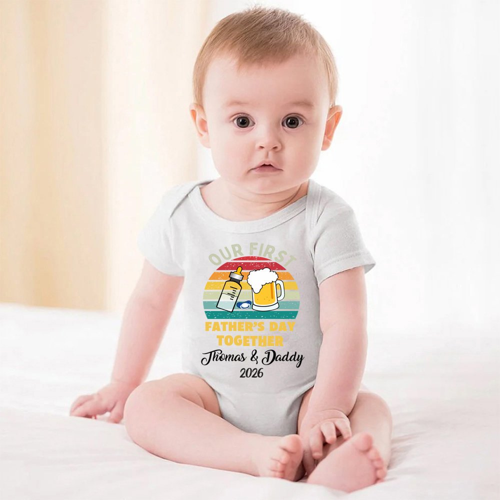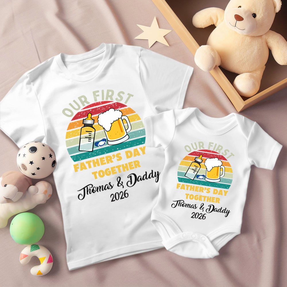 Questo set unico presenta un biberon e una bottiglia di birra che possono essere personalizzati con i nomi di vostra figlia o vostro figlio e l'anno di nascita. La maglietta abbinata ha anche un messaggio speciale che recita "La nostra prima festa del papà" e rappresenta un ottimo modo per mostrare il vostro amore per il vostro piccolo.
