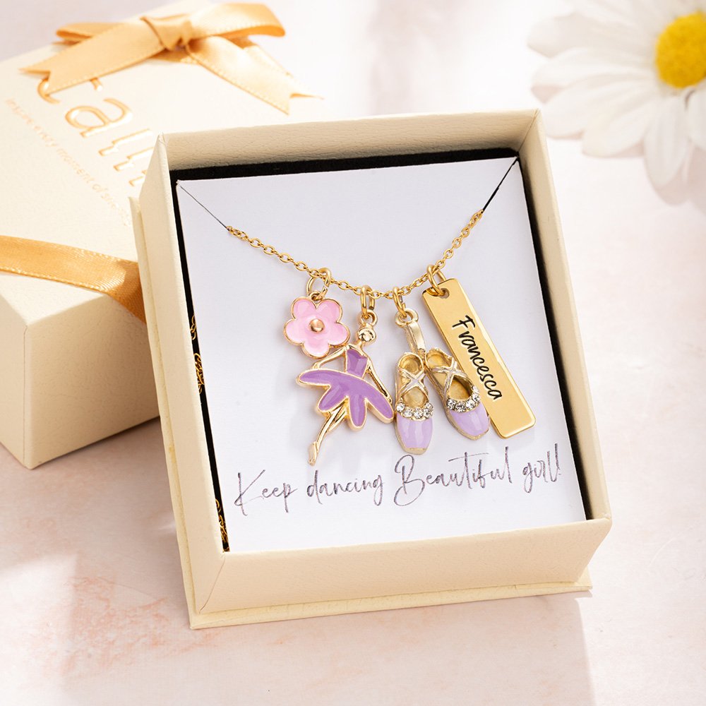 La nostra collana unisce gli elementi del balletto: c'è una ballerina e scarpette da danza come charm, abbinate a fiori che fondono forza e dolcezza. Questo esprime l'eleganza e la vitalità interiore della danzatrice, nonché l'amore e la passione per il balletto. Puoi personalizzare il tuo nome sul charm per renderla unica. Inoltre, la collana è accompagnata da una carda stampata con parole di incoraggiamento "Keep dancing beautiful girls!", perfetta per un regalo.