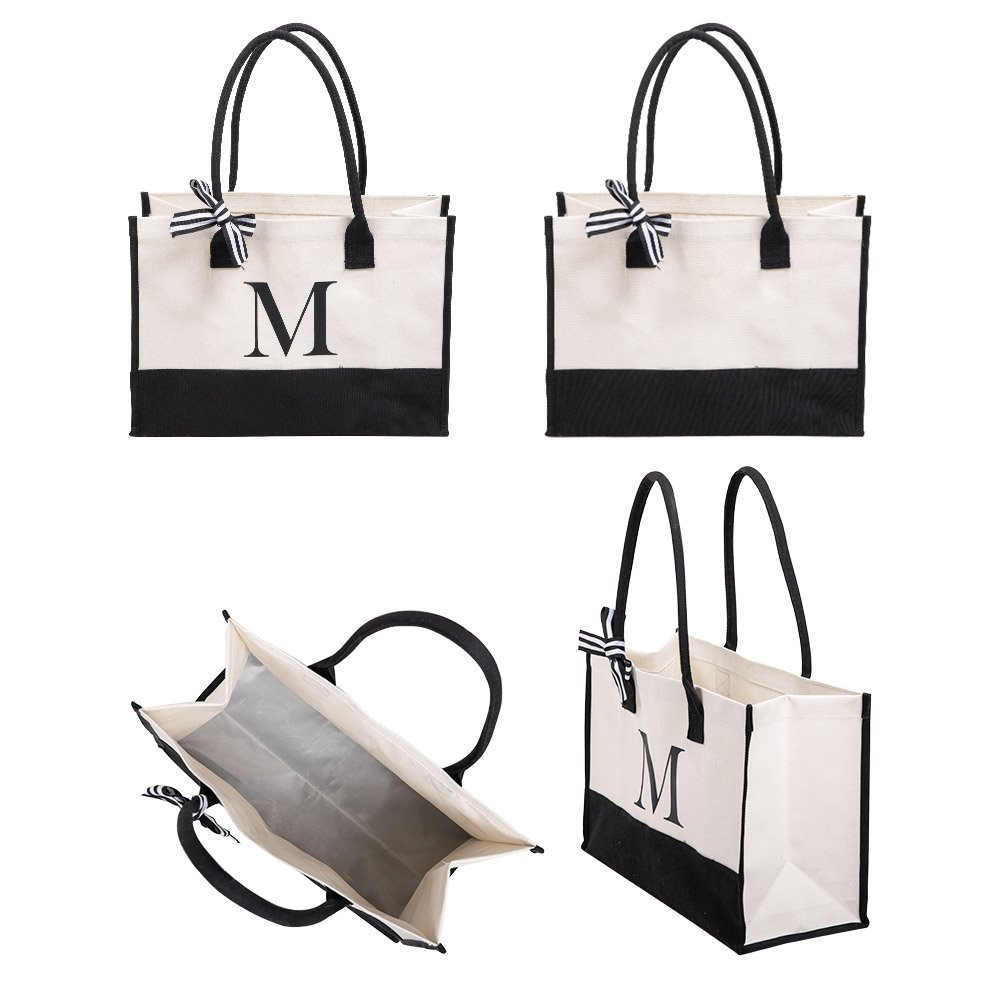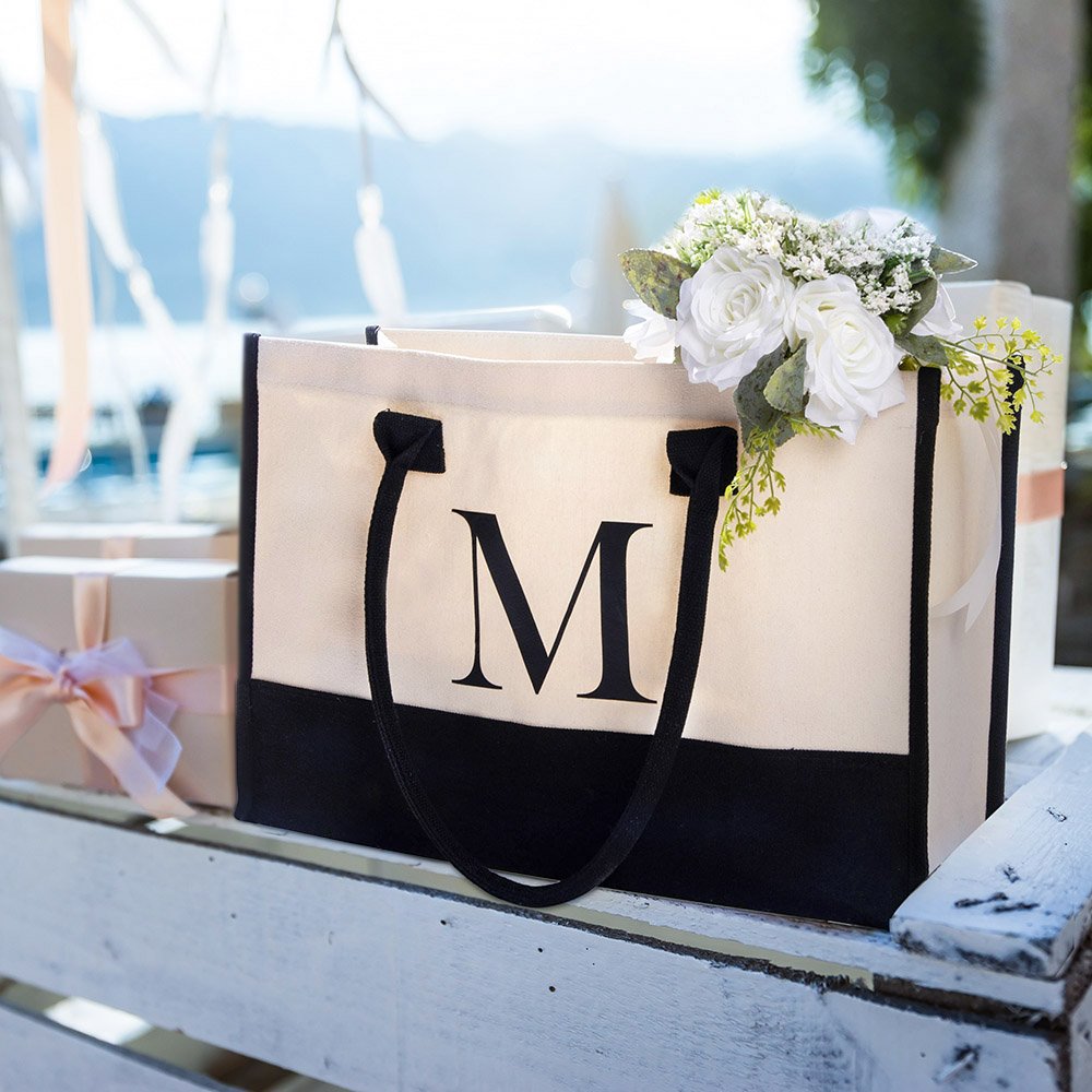 Una tote personalizzata può essere un modo adorabile per ringraziare le damigelle d'onore, le madri degli sposi e gli invitati per il loro amore e il loro sostegno nel vostro giorno speciale. Questa tote bag con monogramma è abbastanza grande da contenere regali più grandi, come un kit spa o un accappatoio.