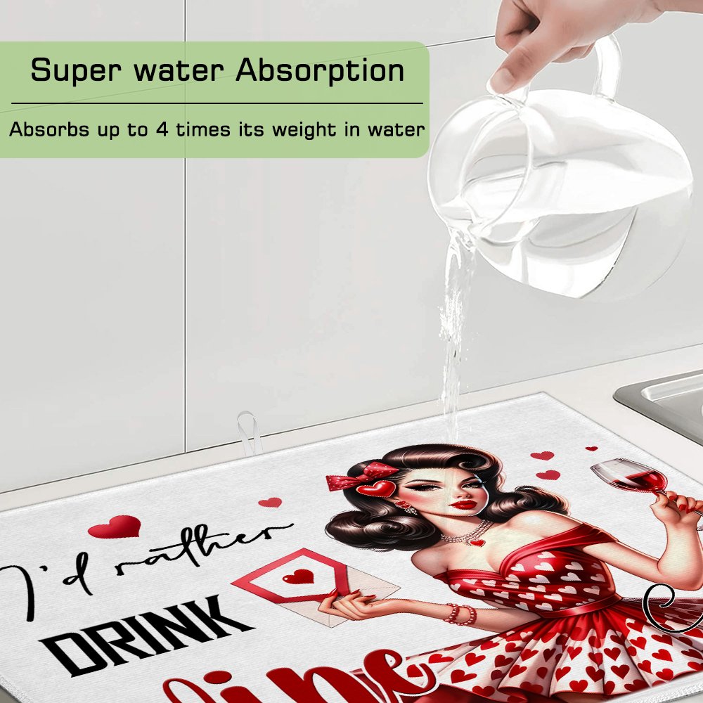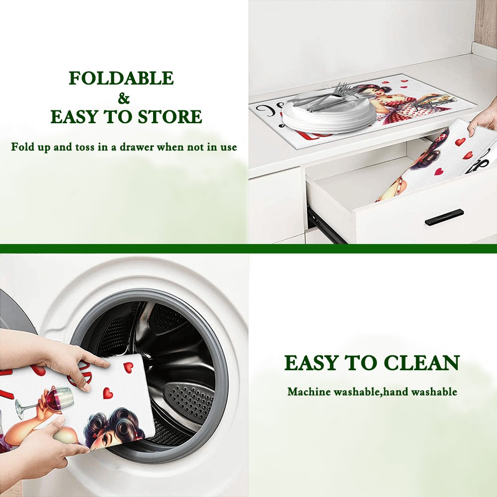 Incoraggiate l'individualità femminile con i nostri tappetini per asciugare i piatti. Questi tappetini sono disegnati con vivaci e affascinanti motivi femminili e parole di fiducia come "La mia cucina, le mie regole" e "La vita è breve, lecca il cucchiaio". Questi disegni simboleggiano il potere delle donne e le incoraggiano a essere indipendenti e a realizzarsi in diversi ambiti della loro vita.