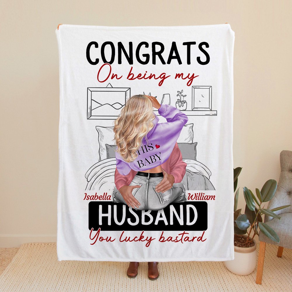La nostra coperta presenta una coppia abbracciata come elemento di design, con un'accogliente camera da letto come sfondo e il testo "Congrats On Being My Husband You Lucky Bastard" per rendere il design complessivo più emotivo. La coperta in sé simboleggia il calore, mentre il disegno dell'amante le conferisce un significato più passionale e romantico, rendendo questa coperta una vera necessità per le coppie.