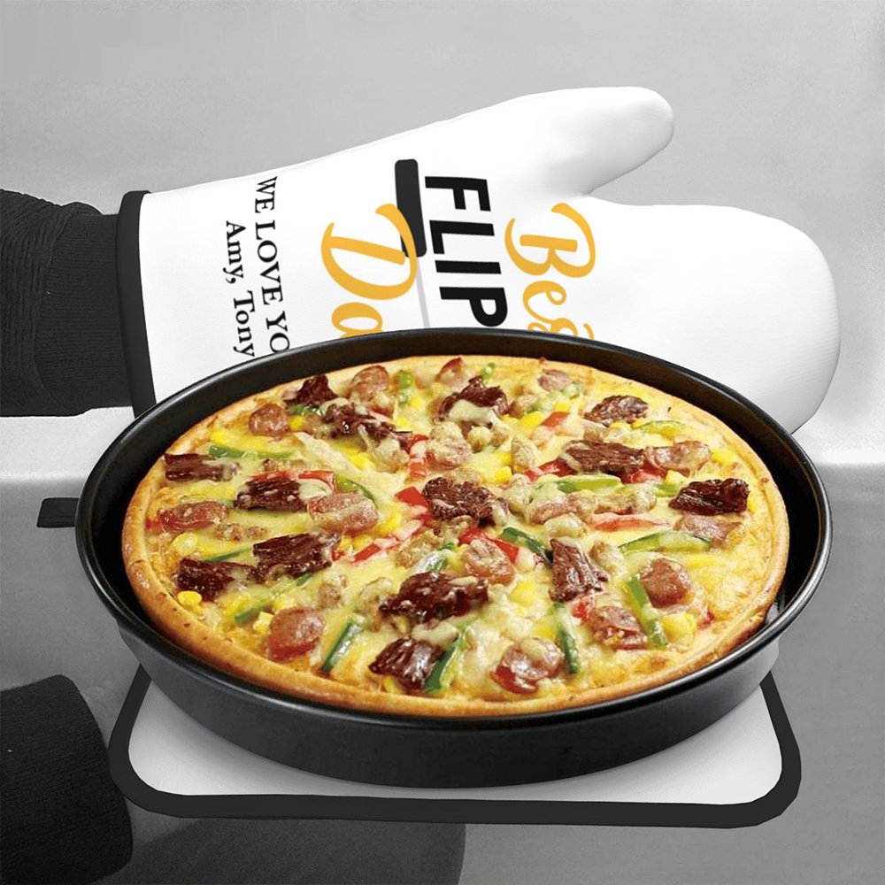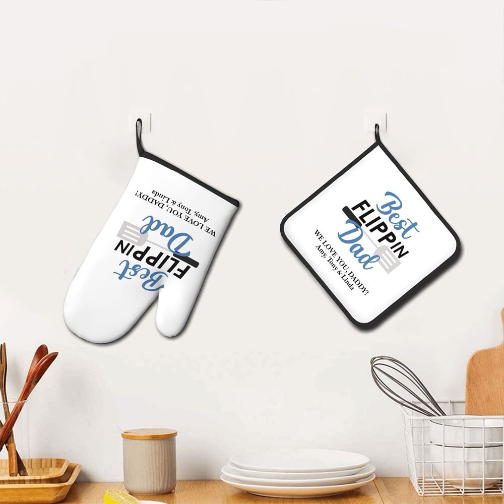 La scritta "Best Flippin Dad" e il design a spatola rendono il guanto da forno e la presina più interessanti, mentre il testo e il nome personalizzati aggiungono un fascino personale. Il guanto da forno e la presina sono progettati per adattarsi alle dimensioni della mano di una persona. È più facile da usare e rimane sempre a portata di mano.