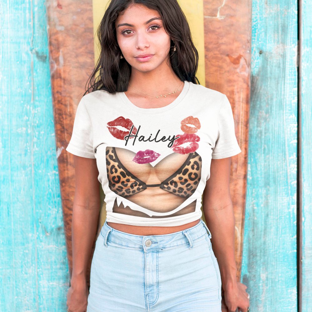 Caratterizzato da un'accattivante stampa bikini abbinata a vivaci segni di bacio, questo crop top irradia seduzione estiva. Personalizzatelo con il vostro nome per creare un pezzo unico che sia esclusivamente vostro.