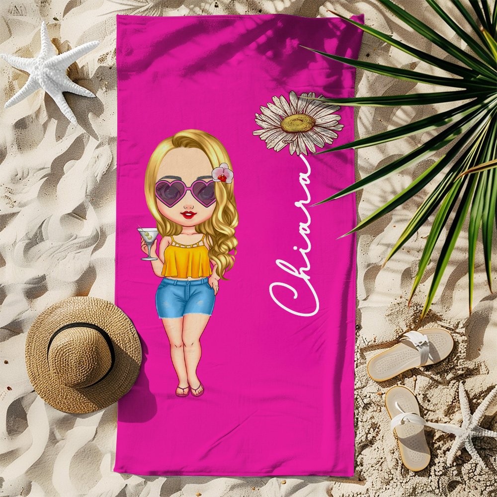 Questo asciugamano da spiaggia unisce un design vivace e divertente, combinando fiori di compleanno e personaggi in stile vacanza. Personalizzalo con il tuo personaggio dei cartoni animati preferito e aggiungi il tuo nome per renderlo ancora più unico. La combinazione di colori e motivi giocosi rende questo asciugamano perfetto per esprimere la tua personalità e portare un tocco di allegria alle tue giornate in spiaggia.