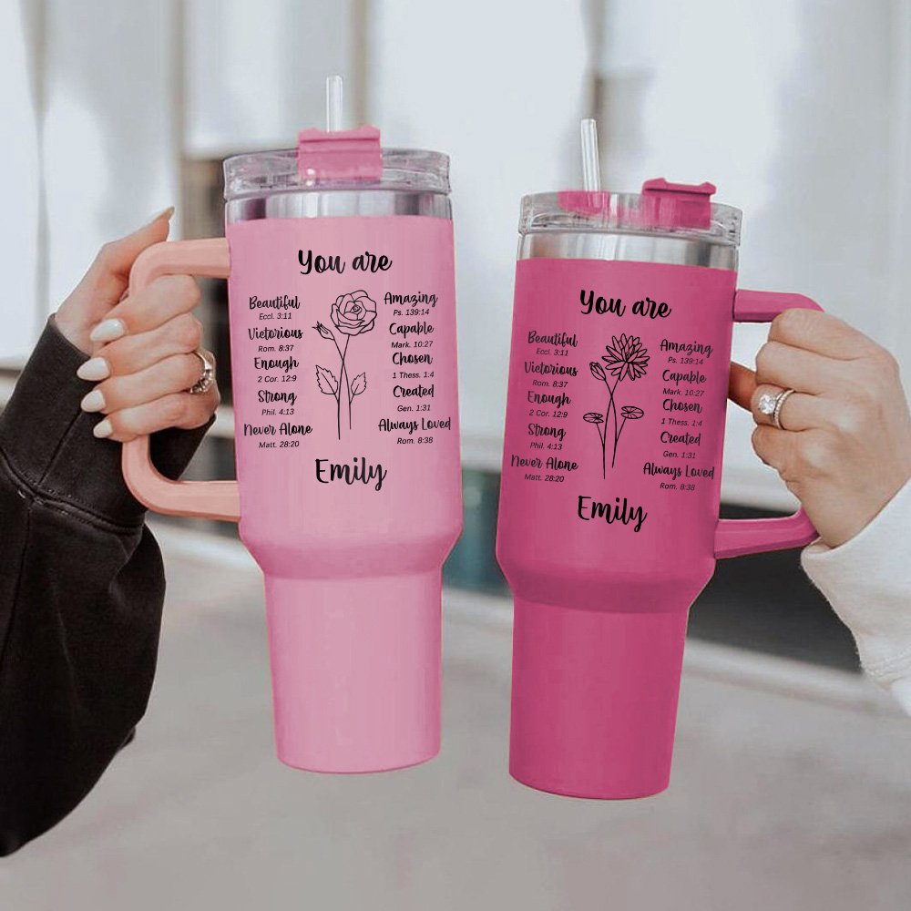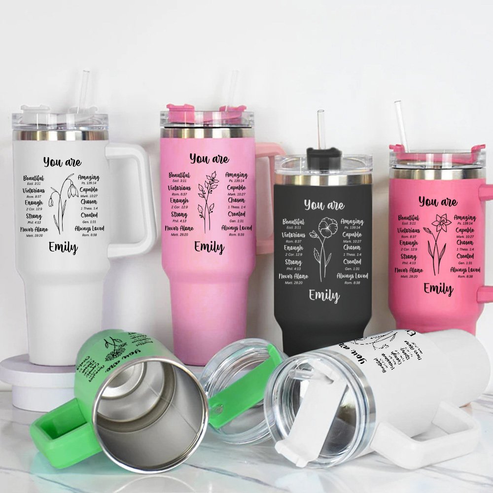 Ogni tumbler include diversi versetti biblici ispiratori, come "Tu sei bella", "Stupefacente" o "Capace", aggiungendo colore spirituale alla vostra esperienza di lettura e ispirazione alla vostra giornata. Possono anche essere personalizzati con il vostro nome e con bellissimi fiori di nascita, trasformandoli in preziosi ricordi che saranno custoditi per molti anni.