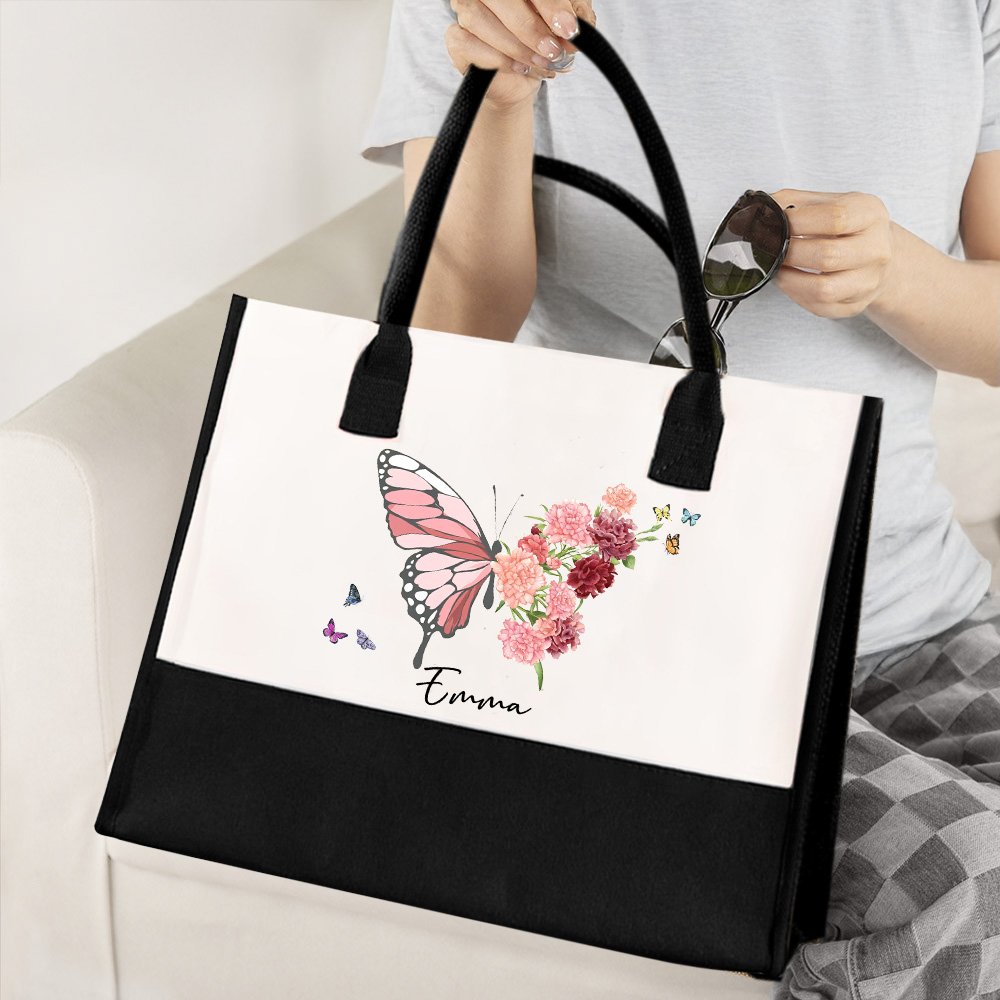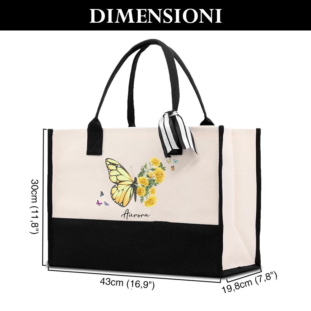 Questa borsa tote si ispira alla perfetta fusione dei simboli floreali dei dodici mesi e degli elementi delle farfalle. Il disegno complessivo presenta un vivace motivo a farfalla, mentre il fiore del compleanno sulla destra non solo celebra la bellezza della natura, ma aggiunge anche un tocco di fantasia e poesia al design. È inoltre possibile personalizzare il nome per rendere questo regalo unico ed esclusivo, perfetto per voi o per una persona speciale.
