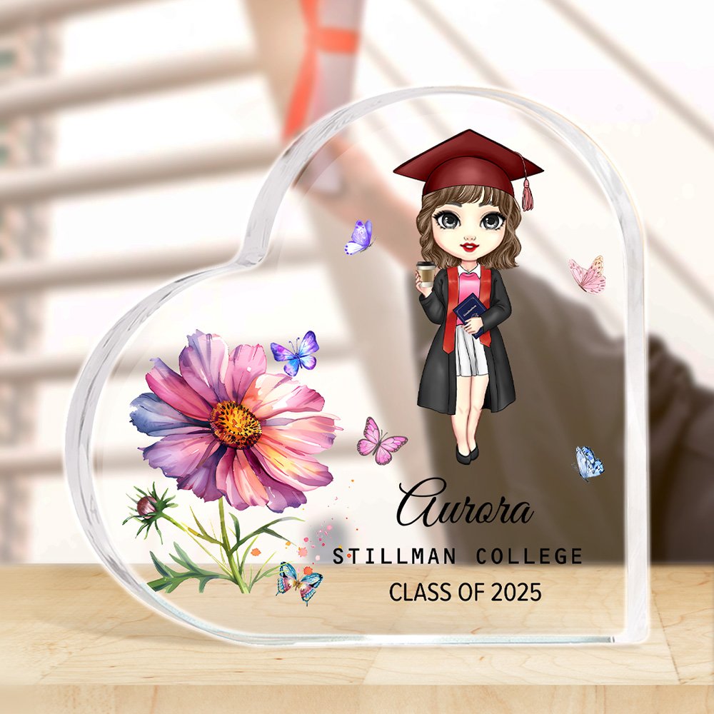 Questa targa in acrilico a forma di cuore è caratterizzata da un vivace personaggio dei cartoni animati e dal disegno di un fiore di nascita, che la rendono un ricordo unico. È possibile personalizzarla con il nome, l'anno di laurea e persino la scuola, creando un tocco personale che celebra questo traguardo.