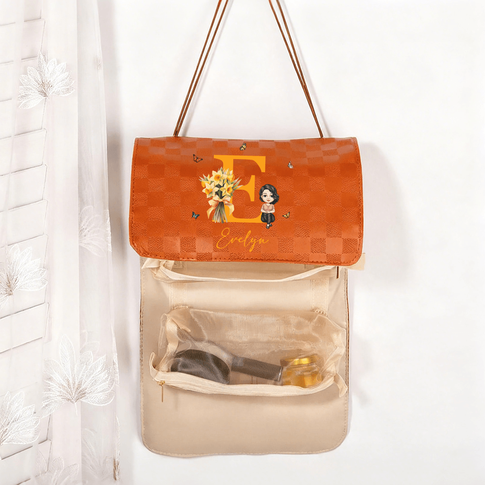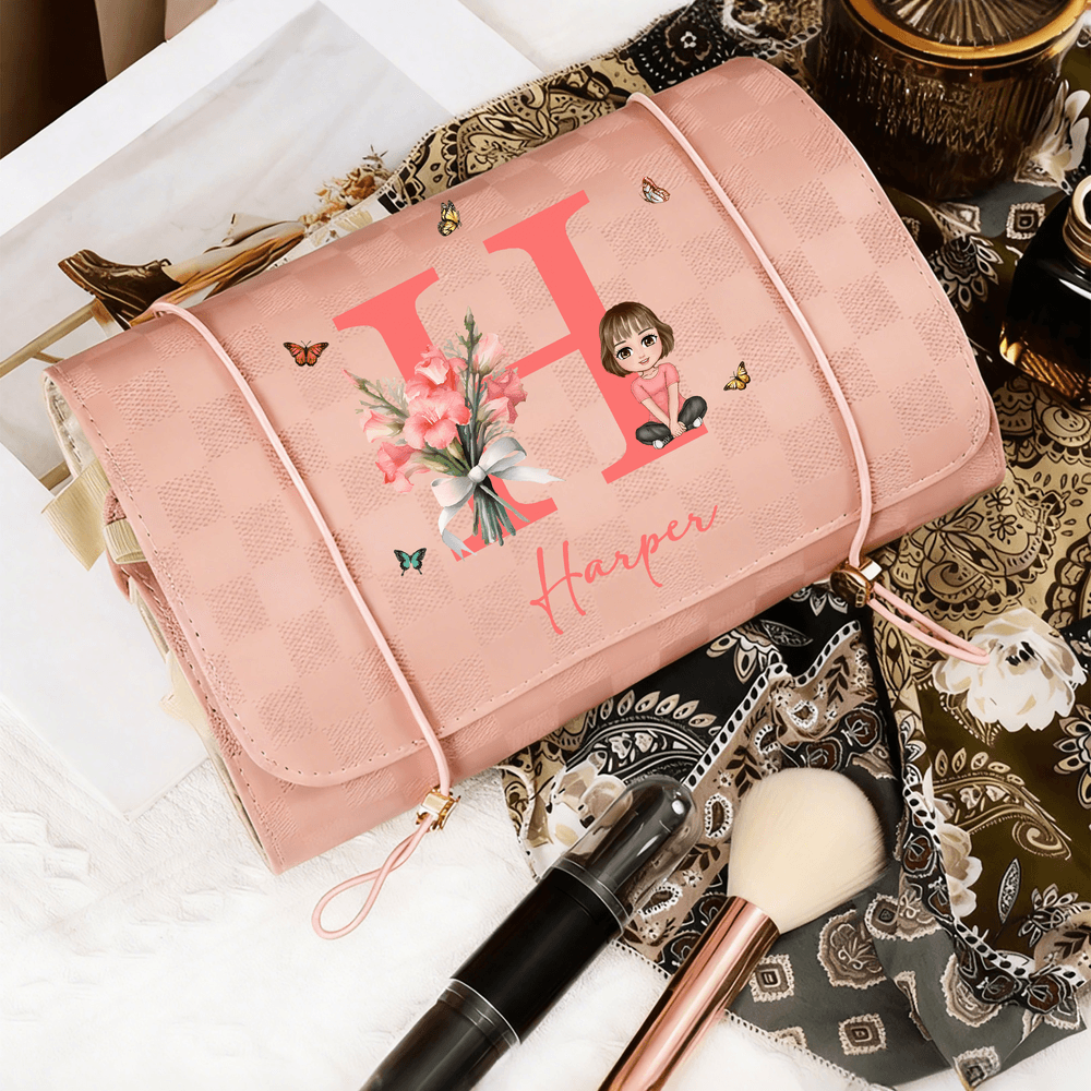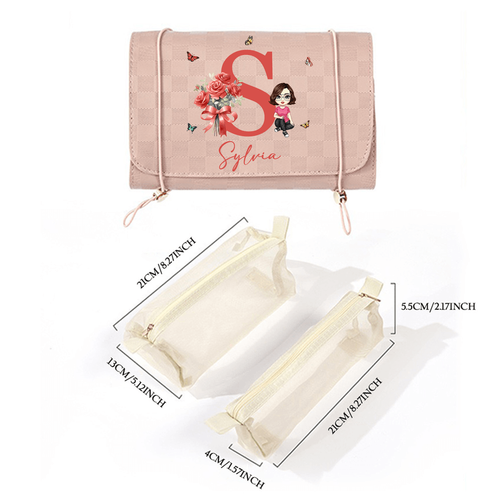 Personalizzato fiore di nascita Cartoon Character PU Leather Makeup Bag con nome e iniziale Uso quotidiano Compleanno Anniversario Regalo per le donne