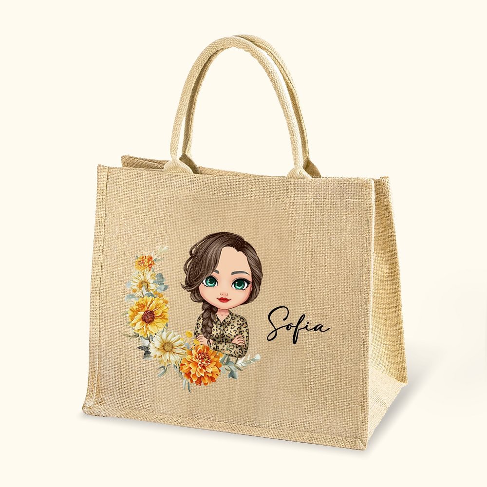 Questa borsa di juta di grande capacità presenta un design personalizzabile con un personaggio in stile cartone animato, su misura per includere un nome speciale. È il modo perfetto per aggiungere un tocco personale al tuo regalo, rendendolo davvero unico.
