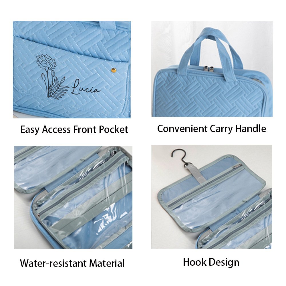 L'interno di questo organizer per il trucco è dotato di uno scomparto impermeabile e di tasche in rete che consentono di separare facilmente gli oggetti bagnati da quelli asciutti. Grazie al design a quattro strati, ha un'ampia capacità di contenere tutti gli articoli da toeletta e i cosmetici. Il gancio incorporato consente di appenderlo ovunque si desideri, mantenendo tutto organizzato e a portata di mano.
