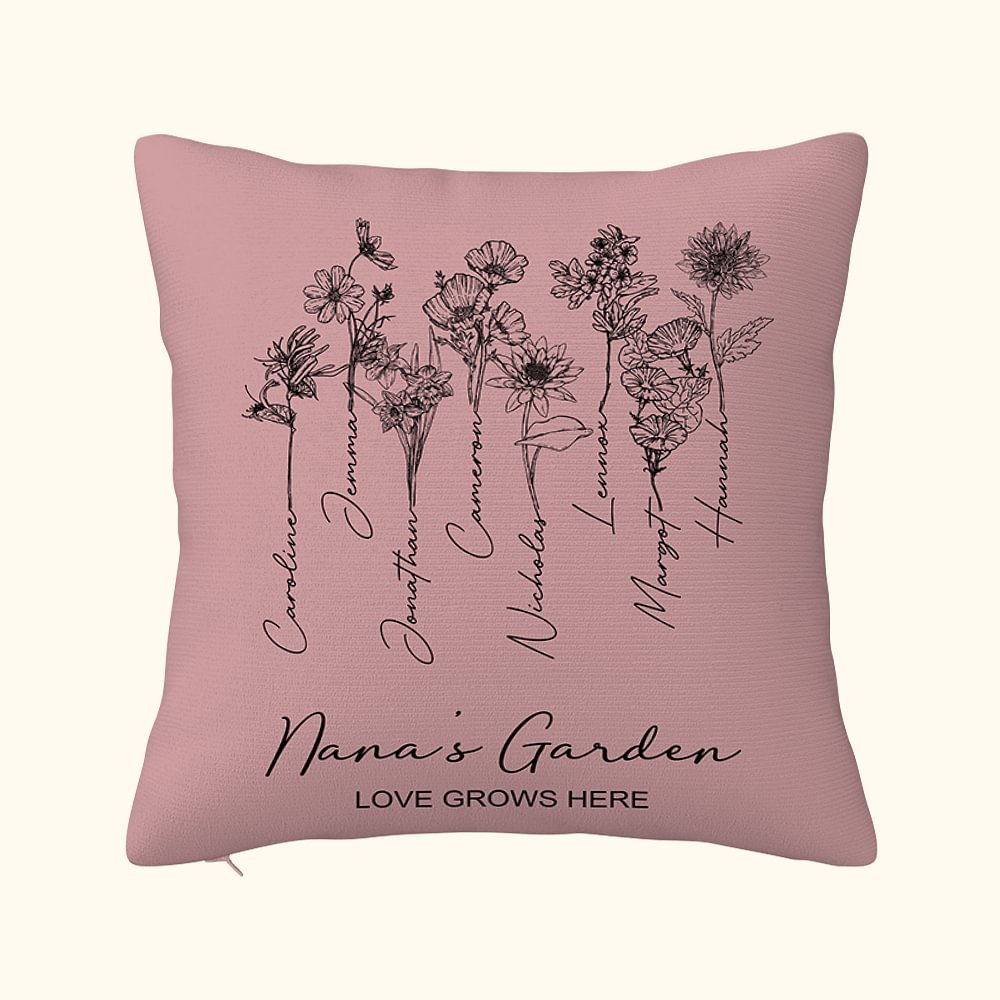 Ciò che distingue veramente questo copricuscino è l'opzione di personalizzazione. Immaginate la gioia sul volto della persona amata quando scoprirà il suo nome elegantemente intrecciato al motivo floreale. La frase "Love Grows Here", ricamata sulla fodera, serve a ricordare l'amore e il calore che permeano il vostro spazio.