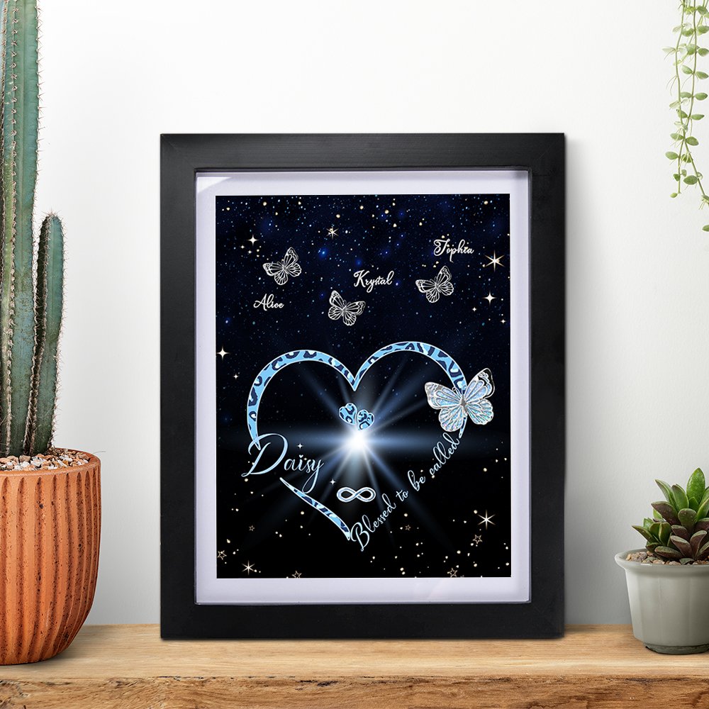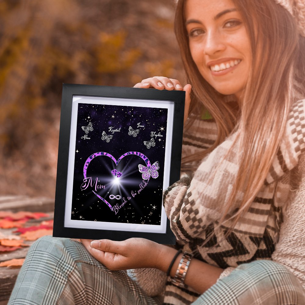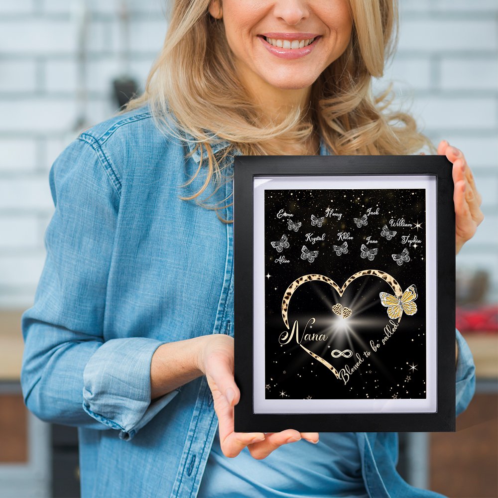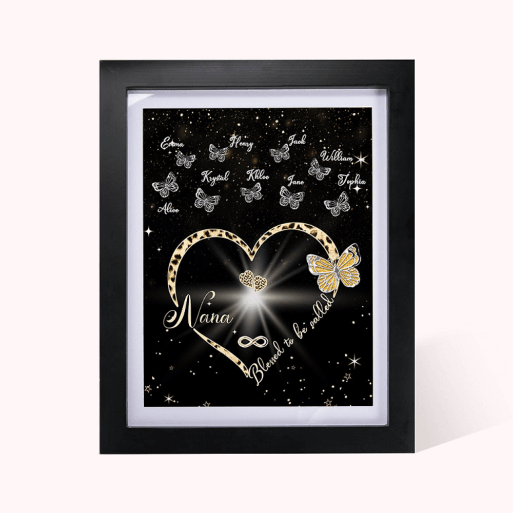 Il portafoto con farfalla a cuore presenta il disegno di un enorme cuore di una mamma o di una nonna insieme a 1-9 piccole farfalle che possono essere personalizzate con i nomi. È la scelta ideale per la mamma o la nonna a Natale o per la festa della mamma.