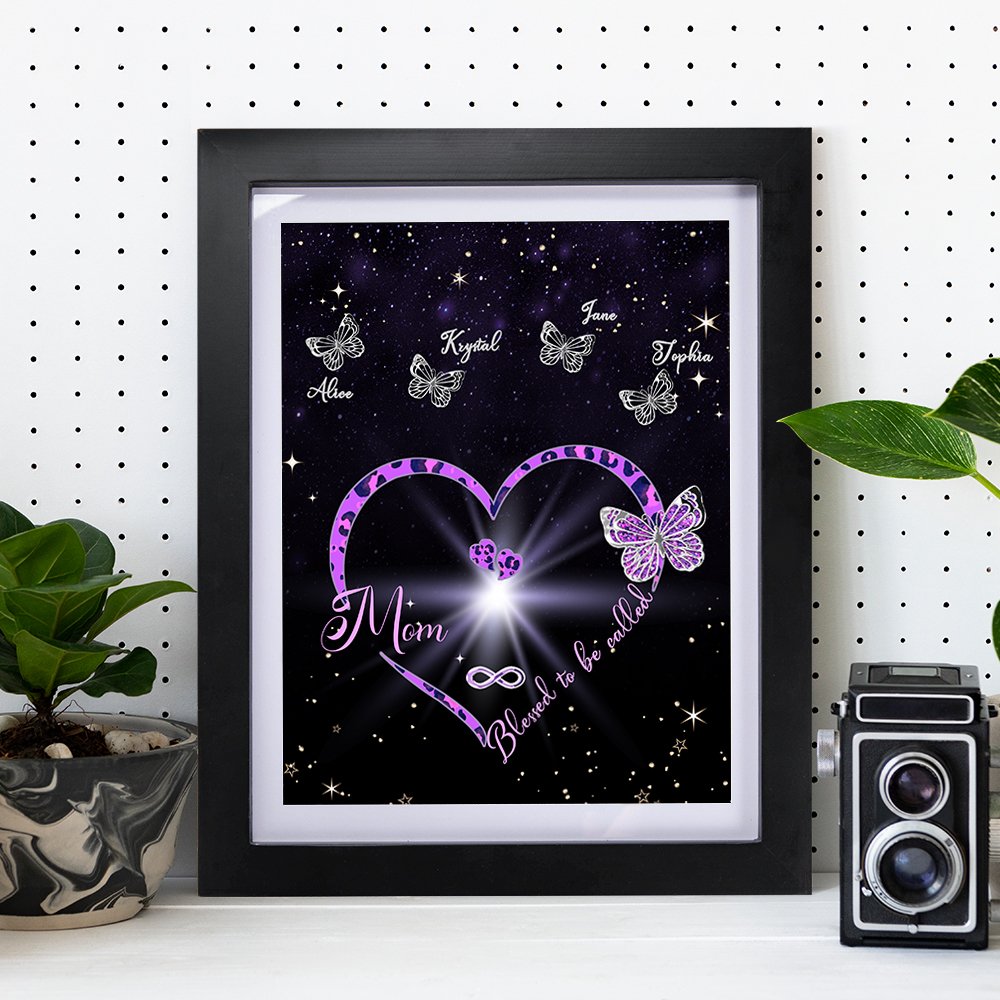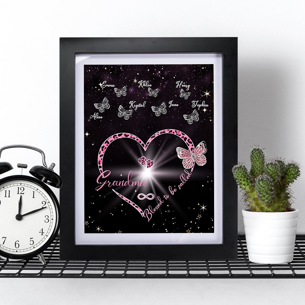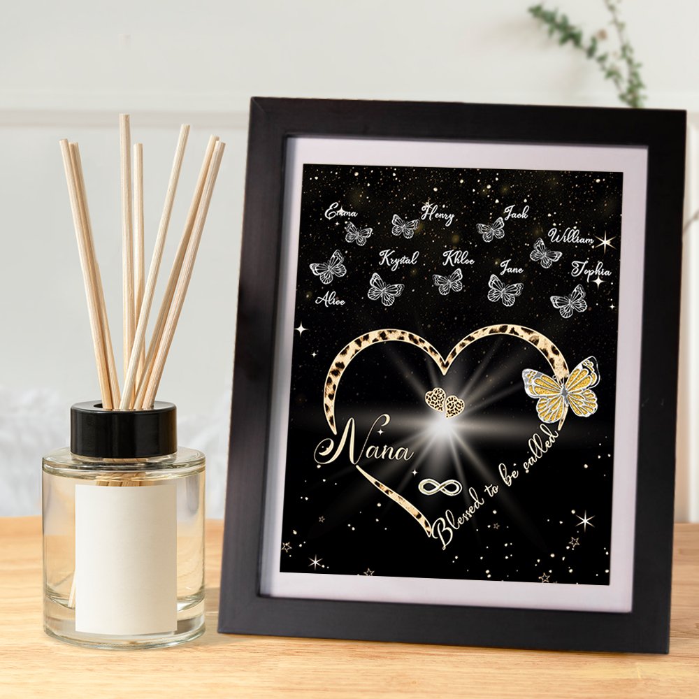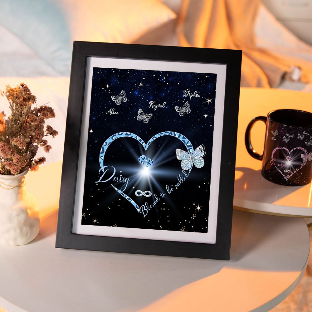 Il portafoto con farfalla a cuore presenta il disegno di un enorme cuore di una mamma o di una nonna insieme a 1-9 piccole farfalle che possono essere personalizzate con i nomi. È la scelta ideale per la mamma o la nonna a Natale o per la festa della mamma.