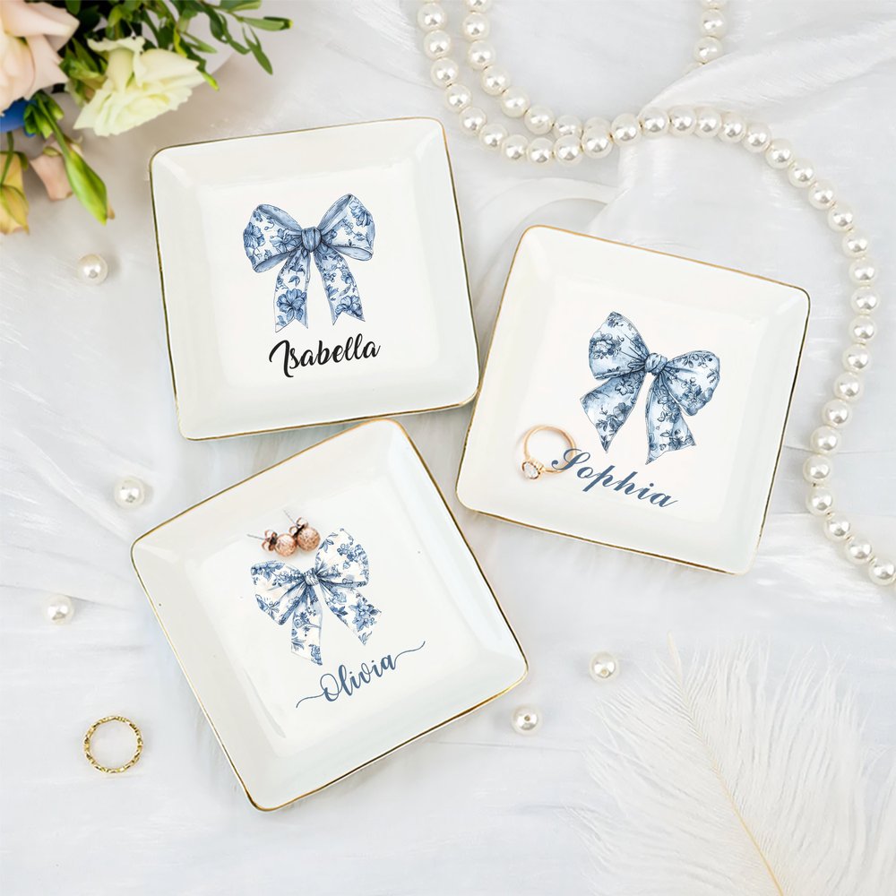 Questo affascinante portagioie in ceramica presenta una varietà di stampe di fiocchi blu retrò ed eleganti disegni di caratteri. È possibile personalizzarlo in base al nome del destinatario e trasformarlo in un souvenir unico per celebrare l'individualità.