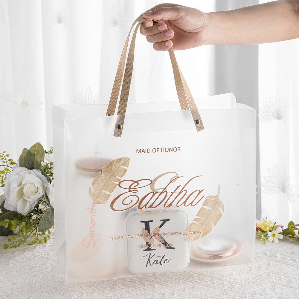 Grazie alle sue dimensioni perfette, la nostra borsa in PVC può ospitare comodamente regali significativi per le damigelle d'onore o per gli invitati a una festa di compleanno. Che si tratti di un gioiello personalizzato o di un piccolo segno di apprezzamento, questa borsa metterà in risalto il regalo scelto.