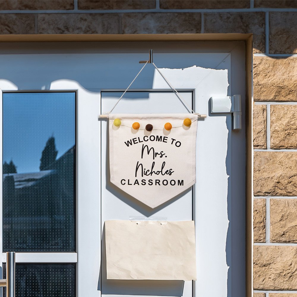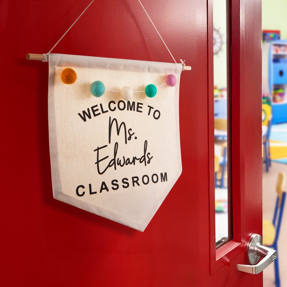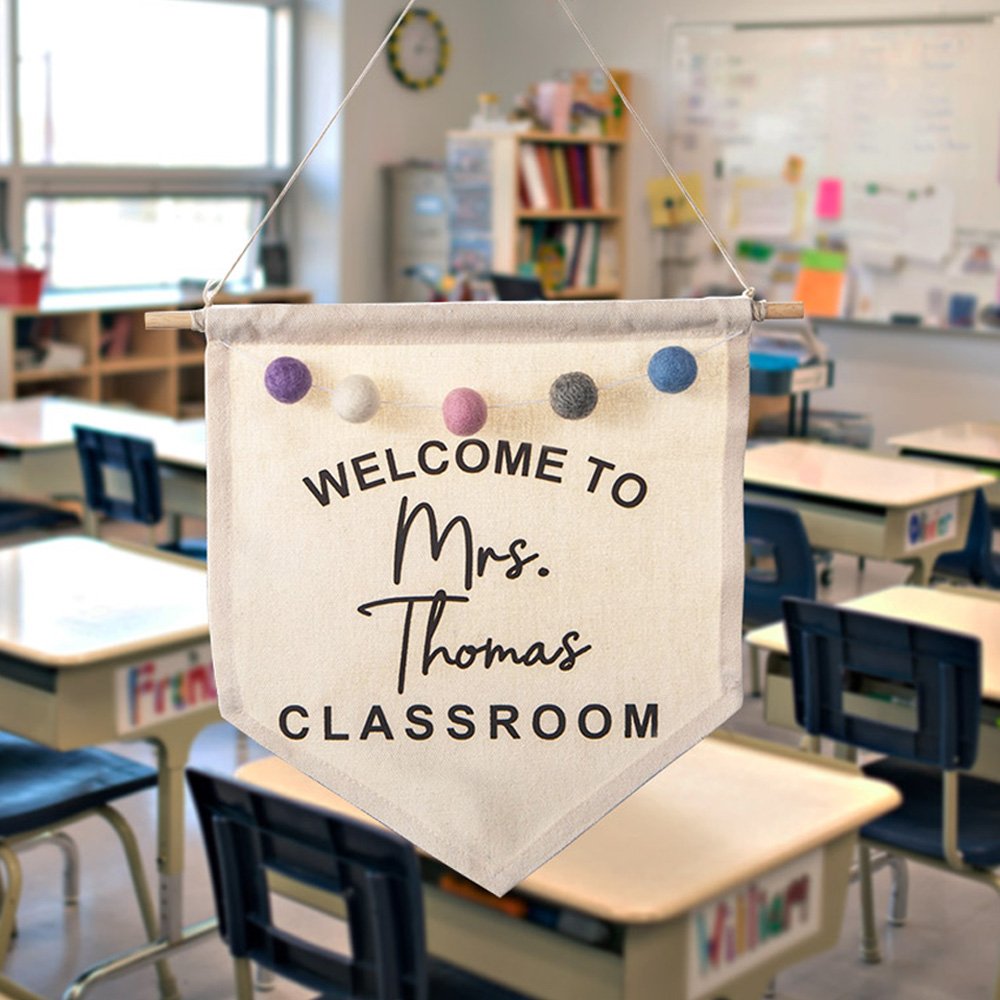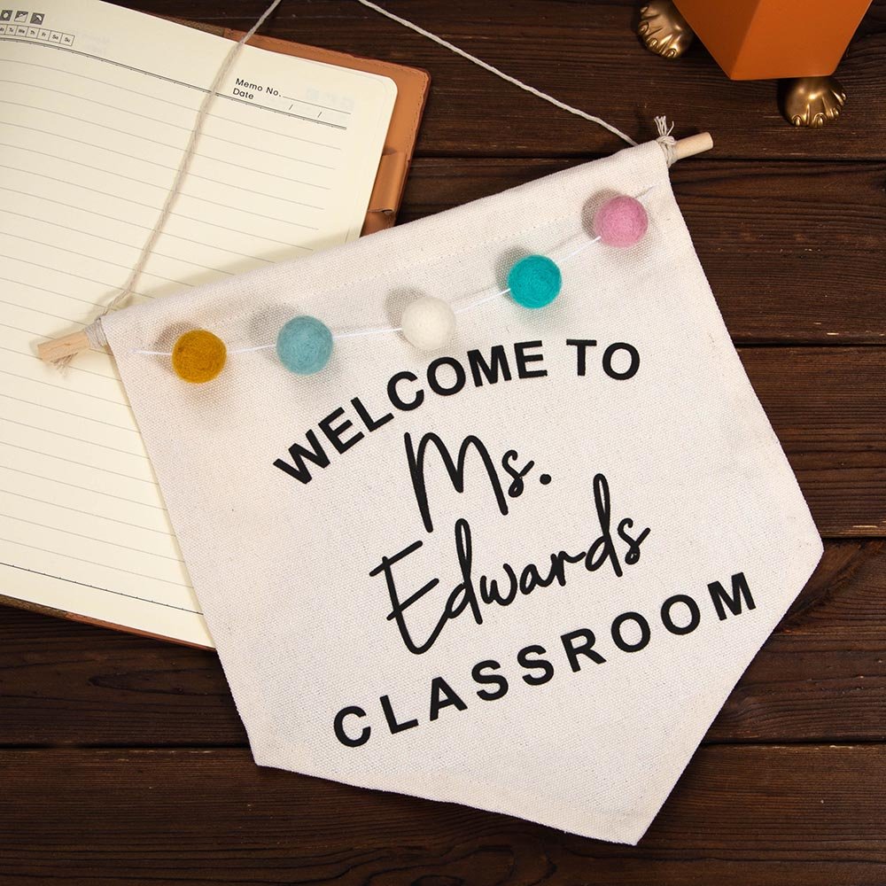 Questo cartello di benvenuto per la classe è il regalo perfetto per insegnanti ed educatori. Può essere appeso fuori dalla porta dell'aula, alla finestra o ovunque all'interno della classe. Con la possibilità di personalizzare i colori delle palline di feltro e il nome dell'insegnante, diventa un pezzo unico.