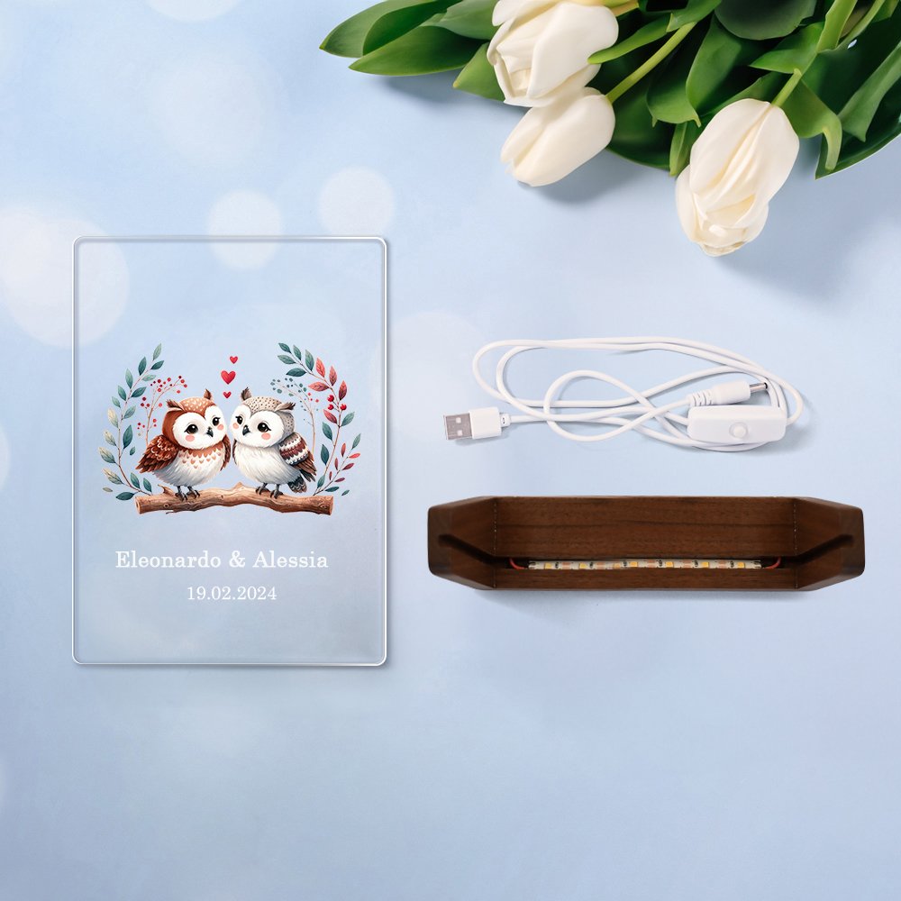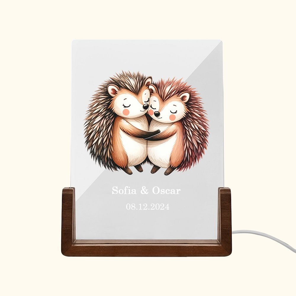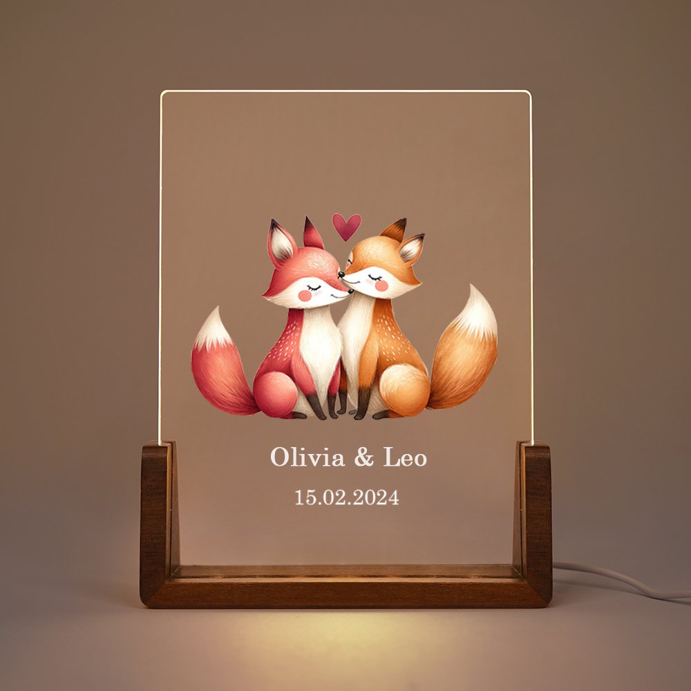 La nostra luce notturna raffigura dei adorabili coppie di animali addormentati.Puoi scegliere il tuo animale preferito tra 10 tipi di animali Il cartone animato sereno e stravagante crea un'atmosfera da sogno e accompagna a un dolce sogno. Inoltre è possibili personalizzarlo con due nomi e una data di memoria