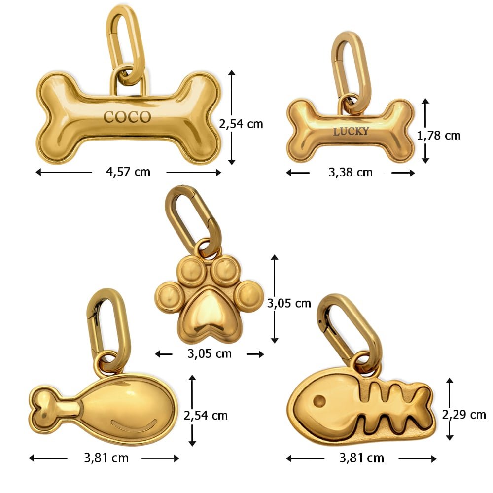 Le nostre medagliette personalizzate per animali domestici hanno forme adorabili come ossi, zampine, lische di pesce e cosce di pollo. Puoi farle incidere con il nome, il numero di telefono, l’indirizzo o altri contatti. Disponibili nelle finiture oro e argento, diventano un accessorio d’identità unico per il tuo compagno peloso.