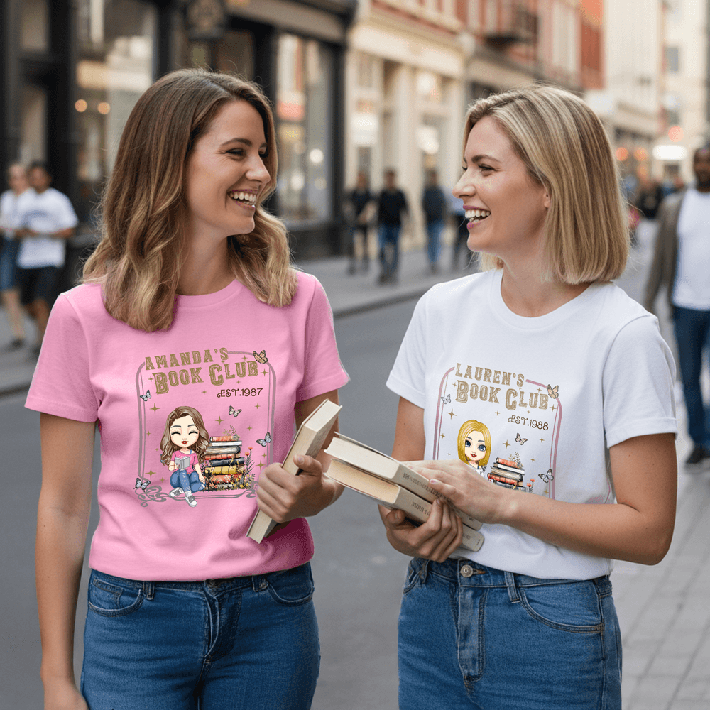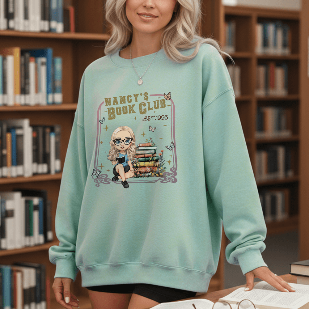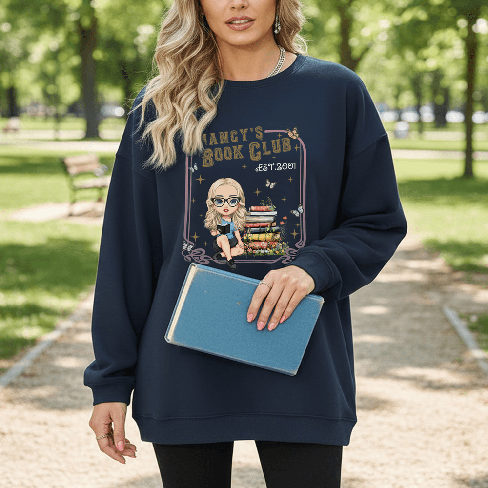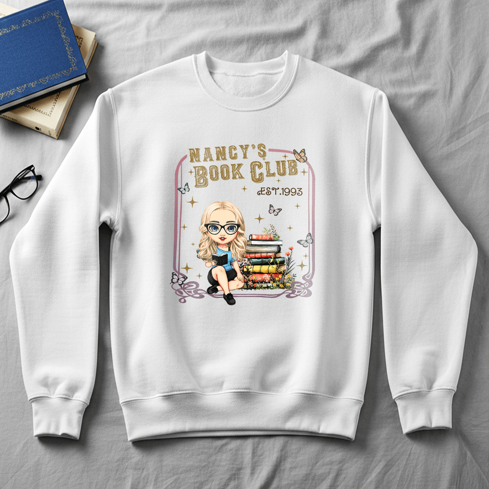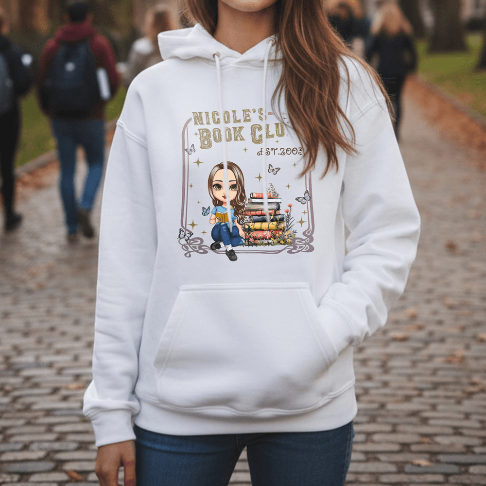 Caratterizzato da un'immagine cartoon di una donna che legge, completata da motivi sognanti di libri, farfalle e stelle, questo capo vanta uno stile artistico ma giocoso. È disponibile la personalizzazione del nome, che integra perfettamente la vostra identità individuale nel design generale per evidenziare il vostro spirito libresco.