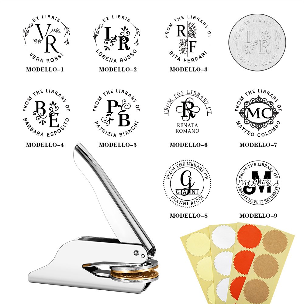 Con questo timbro a secco puoi imprimere il nome o l’iniziale del destinatario su una pagina o su un foglio, creando un segno unico e raffinato per la tua collezione di libri. Il design personalizzato ti permette di rendere ogni volume riconoscibile e davvero tuo.