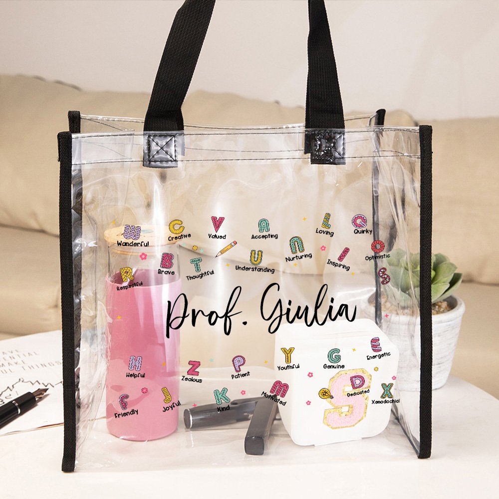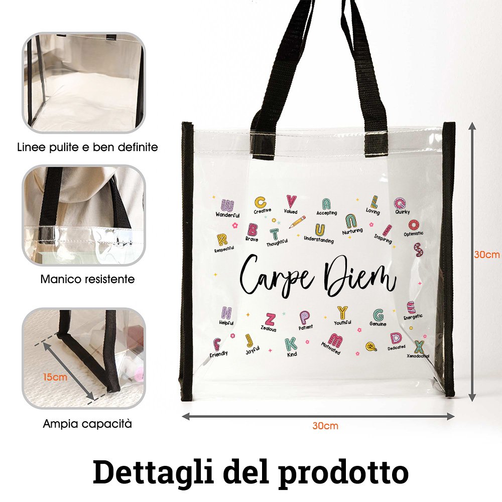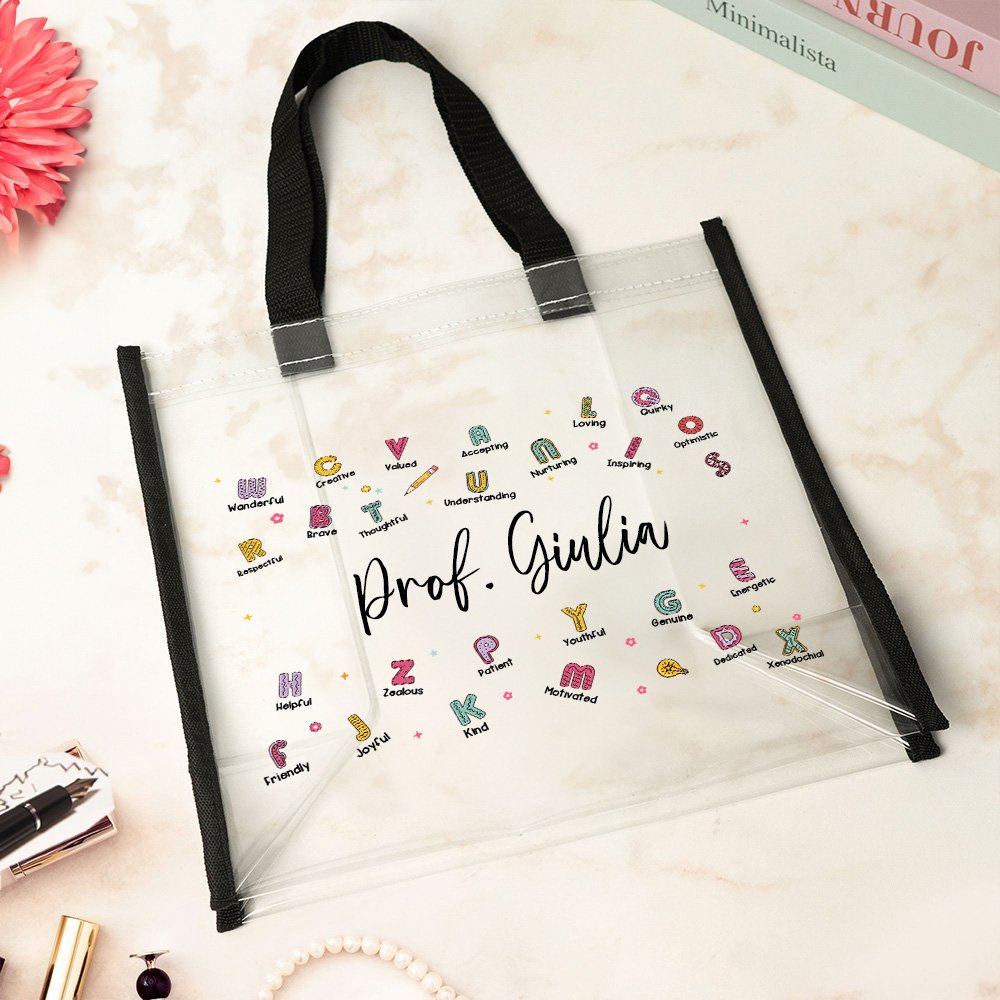 Questa borsa trasparente è un’idea regalo versatile e originale per amici, colleghi, insegnanti o studenti. Perfetta per ogni occasione: festa dell’insegnante, compleanni, festa dei bambini o festività. Pratica e significativa, è adatta a scuola, lavoro o uscite informali.
