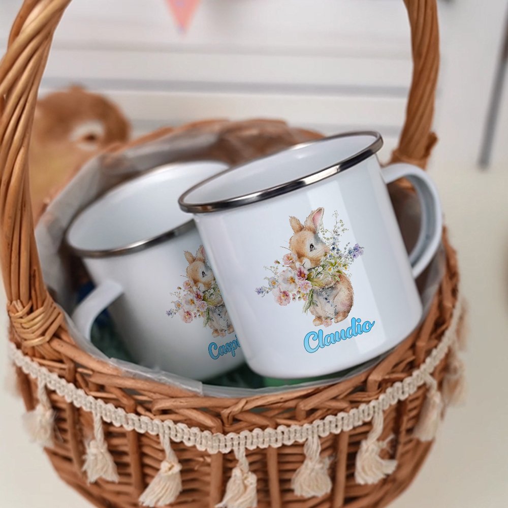 Tazza smaltata con deisgn coniglietto che tiene il fiore personalizzata con nome regalo di compleanno per bambini