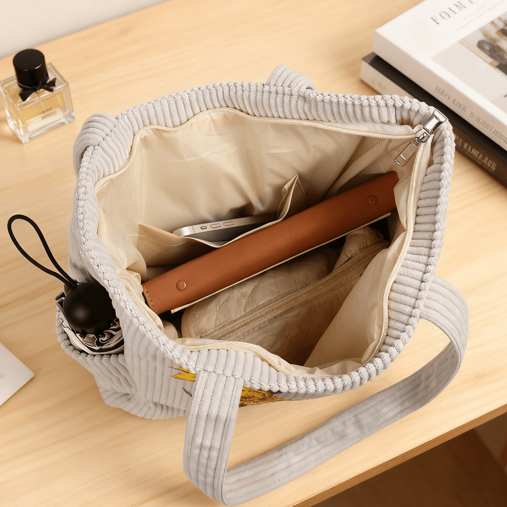 Realizzato in morbido e spesso velluto a coste di alta qualità, questo modello è confortevole al tatto e resistente alla deformazione. Presenta spallacci larghi per una vestibilità comoda e senza restrizioni. L'ampio scomparto principale e le tasche laterali offrono spazio per riporre e decorare.