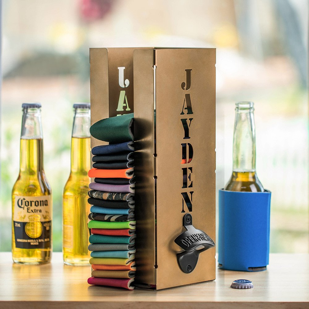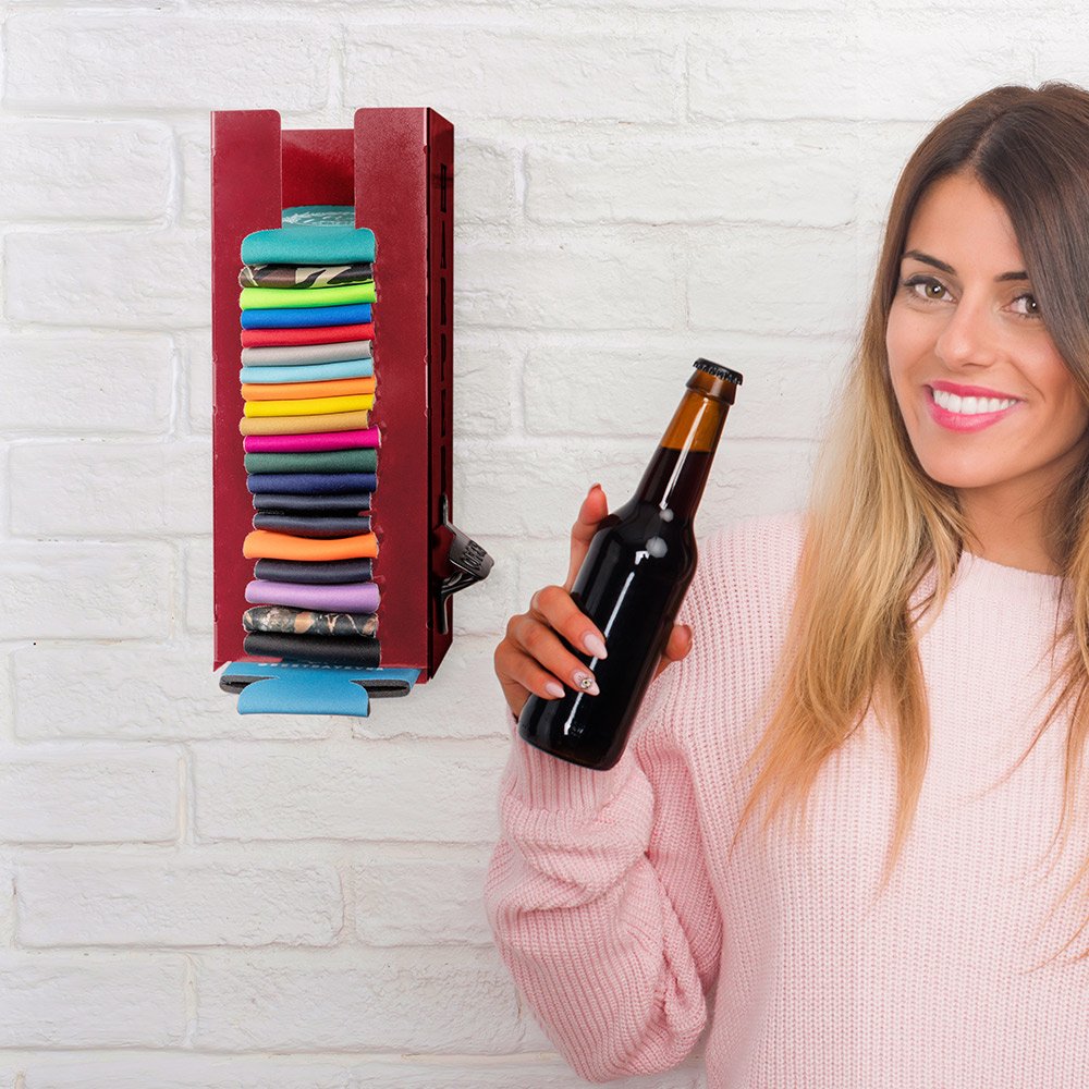 Questo supporto è una vera meraviglia multifunzionale, con uno spazioso scomparto principale che accoglie facilmente il refrigeratore per birra e lo mantiene ben organizzato. L'apribottiglie integrato è comodamente posizionato sul lato, consentendo di aprire facilmente la vostra bevanda preferita senza dover cercare uno strumento separato. È dotato di un foro appositamente progettato sul retro, in modo da poter essere appeso alla parete o appoggiato sul tavolo.