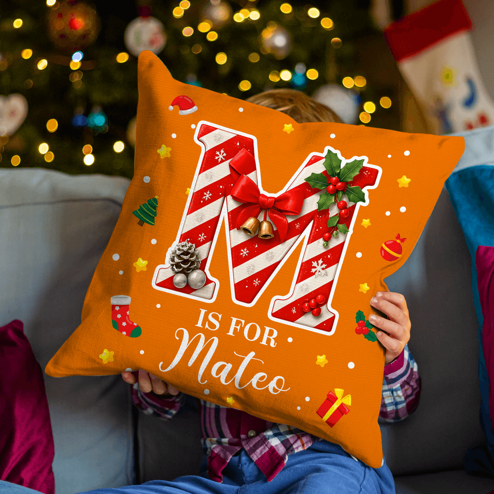 Con un forte tema natalizio al centro, questo cuscino presenta lettere tridimensionali nello stile dei bastoncini di zucchero a strisce rosse e bianche, ornate da elementi natalizi come fiocchi rossi, campanelle dorate, foglie di agrifoglio e pigne. Può anche essere personalizzato con un nome, per dare un tocco di festa unico e personalizzato.