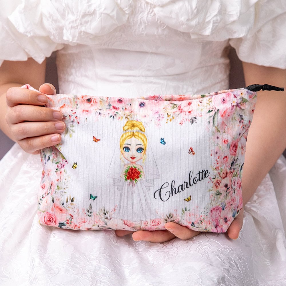 Questa trousse per il trucco è caratterizzata da un'incantevole selezione di sfondi floreali e da immagini cartoon personalizzabili della sposa e delle damigelle. Questo delizioso design lo rende un regalo innovativo e unico, perfetto per matrimoni e docce nuziali, garantendo che ogni borsa sia unica come la persona per cui è stata creata.