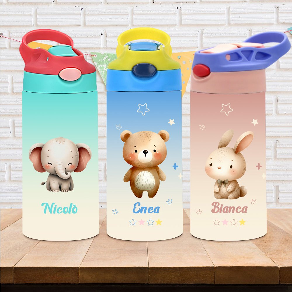 Questa borraccia presenta 61 adorabili animali in stile cartone animato - orsi, gattini, leoni e tanti altri - abbinati a simpatiche stelle per un tocco di allegria. Con 7 varianti di colore di sfondo (rosa, blu, verde, giallo ecc.), puoi scegliere il tuo animale preferito e aggiungere il tuo nome: ogni sorso diventa un momento divertente e personale.