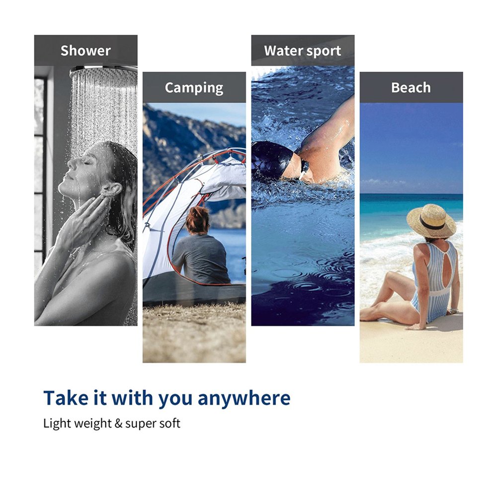 Tessuto di alta qualità, morbido al tatto, la microfibra sul dorso assorbe l'acqua in pochi secondi, il processo di ispessimento ne garantisce la durata, non facile al pilling e allo sbiadimento. Spallaccio oversize a copertura totale, design leggero che si ripiega fino a raggiungere le dimensioni del palmo della mano, senza occupare spazio quando si trasporta con la borsa da bagnino.