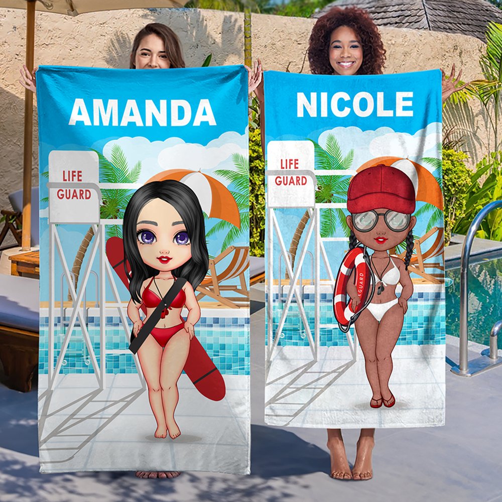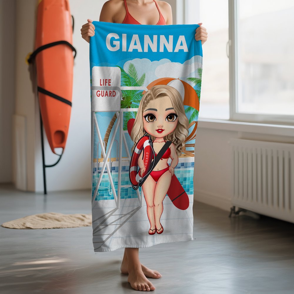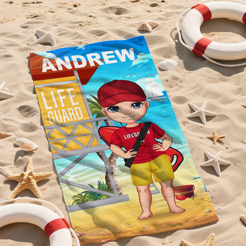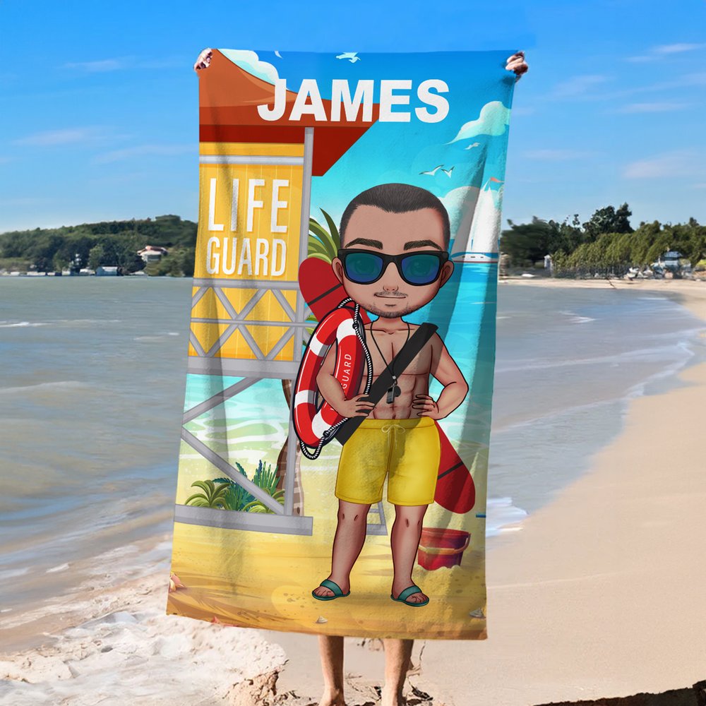Il telo mare è personalizzato con l'immagine di un bagnino.