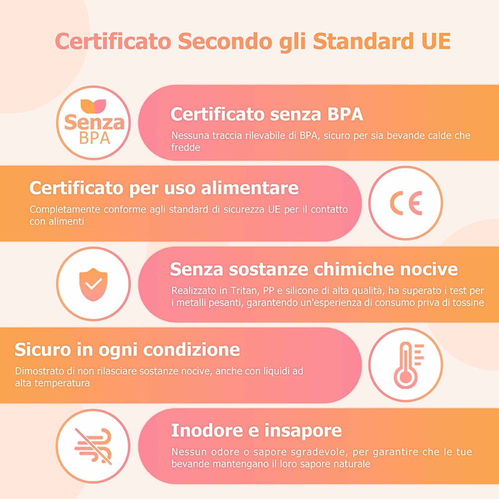 | Cura: | - Non mettere la borraccia in lavastoviglie o nel microonde. La pulizia può essere effettuata facilmente con un detersivo delicato e acqua calda. - Non superare i 45 °C di temperatura. La borraccia non è isolata termicamente e potrebbe scottare se riempita con acqua calda. - Il coperchio della borraccia garantisce una buona tenuta, facendo aumentare gradualmente la pressione interna. All'apertura, potrebbe fuoriuscire acqua. Si consiglia di non puntarla verso persone e di rilasciare la pressione prima di bere. - Conservare la borraccia pulita e asciutta in un luogo fresco e asciutto, lontano dalla luce diretta del sole, per prevenire la formazione di muffa o funghi. - Si consiglia di sostituire la borraccia ogni 6-12 mesi. |